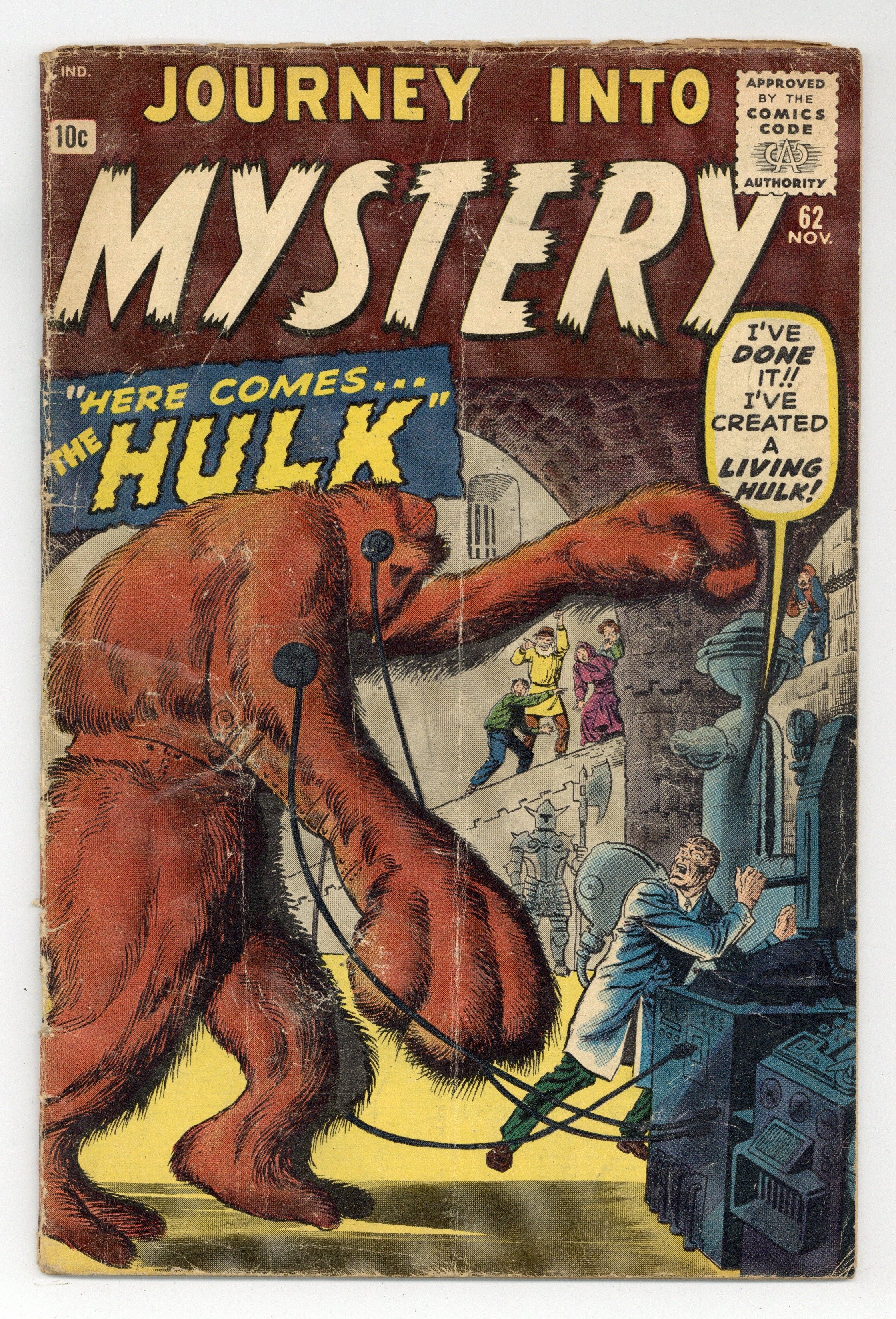 Cover pencils by Jack Kirby, inks by Steve Ditko. "Here Comes the Hulk!", a.k.a. I Was a Slave of the Living Hulk!", is a great 13-page scientist-versus-giant-monster story with art by Jack Kirby/Dick Ayers, but it is not the origin of the Incredible Hulk; But back in the 1960s that fact didn't keep a prominent comics dealer from advertising Journey into Mystery #62 to unsuspecting comic collectors as the "Hulk origin issue"; That prominent dealer was not, by the way, Lone Star Comics, nor was it our friends at Mile High Comics (who were still years away from selling their first comic)! "Strange Mission" text story, art by Joe Maneely. "There Is a Brain Behind the Fangs!", art by Don Heck; A man is convinced that dogs are secretly planning to take over the world; His friend hypnotizes a dog and proves that it cannot understand complex questions. Neither suspects that the dog has been hypnotized by the cat. "I Can't Escape from the Creeping Things!", art by Steve Ditko; A greedy businessman tries to cut down an ancient tree and is attacked by its branches during the night. 36 pgs., full color. Cover price $0.10.