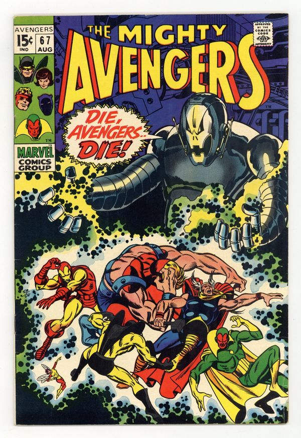 "We Stand at Armageddon!" Part 2 of 3. Script by Roy Thomas. Pencils by Barry Windsor-Smith. Inks by George Klein. Cover by Sal Buscema and Sam Grainger. Ultron-6 rampages through Avengers Mansion! And Earth's Mightiest Heroes are helpless to stop the metal monster now composed of pure adamantium! After steamrolling the Avengers, Ultron flies away; but the Vision follows him back to his lair! Ultron plans to detonate a nuclear device in New York City! And only the synthezoid avenger stands in his way!Can the Vision derail his creator's atomic dreams? Cameo appearances by Dum Dum Dugan, Gabe Jones, and Contessa Valentina Allegra de la Fontaine. Avengers Lineup: Goliath, Iron Man, Thor, Vision, Wasp, and Yellowjacket. (Notes: This issue is Ultron's first cover appearance. This issue was reprinted in Marvel Super Action #28.) 36 pages. Cover price $0.15.