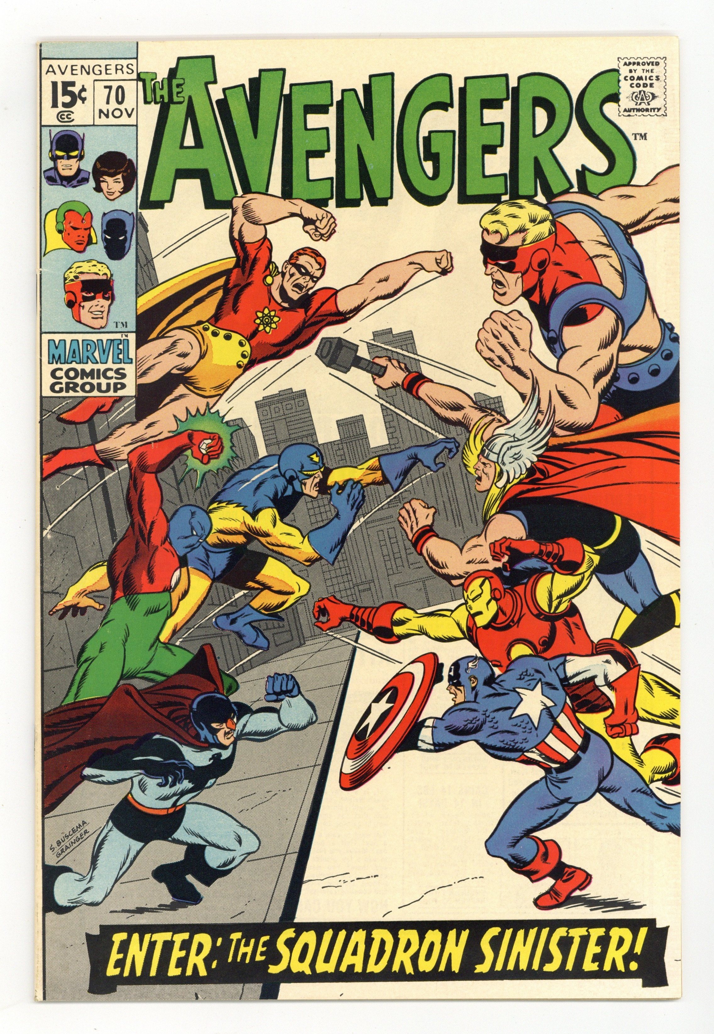 "When Strikes the Squadron Sinister!" Part 2 of 3. Script by Roy Thomas. Pencils by Sal Buscema. Inks by Sam Grainger. Cover by Sal Buscema and Sam Grainger. The galactic game between Kang and the Grandmaster begins! And the opening round pits Earth's Mightiest Heroes vs. the Squadron Sinister! Captain America vs. Nighthawk on Liberty Island! Iron Man vs. Doctor Spectrum at the Taj Mahal! Thor vs. Hyperion in Egypt! And Goliath vs. the Whizzer in London! The Avengers need four victories to win the first round for Kang! The Conqueror's team appears on track for a worldwide sweep until the Black Knight unwittingly interferes with Goliath's duel at the Big Ben Clock Tower! The Grandmaster is furious about the knight's interference! Have Dane Whitman's good intentions accidentally doomed the Earth to destruction? First full appearance of the Squadron Sinister (and Kyle Richmond aka Nighthawk). Avengers Lineup: Black Panther, Black Knight, Captain America, Goliath, Hawkeye, Iron Man, Thor, Vision, Yellowjacket, and the Wasp. (Notes: The Squadron Sinister returns in Defenders 13. Shell-Head and Dr. Spectrum battle again in Iron Man 63. Nighthawk appears next in Daredevil 62.) 36 pages. Cover price $0.15.