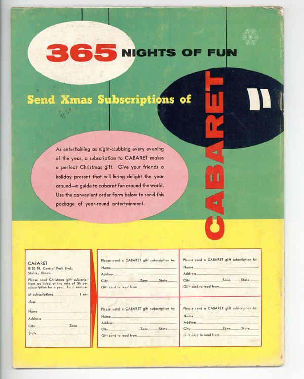 Published Dec 1956 by Publisher's Development Corporation.$10.00Volume 2, Issue 8 - December, 1956. Short-lived vintage men's interest magazine published by George E. von Rosen that ran from May, 1955 to September, 1957. Issues in this series focused heavily on burlesque shows, night clubs, dancers, and celebrities that endorsed the lifestyle. 8.5" x 11", 50 pages, B&W. -MATURE READERS- Cover price $0.50.