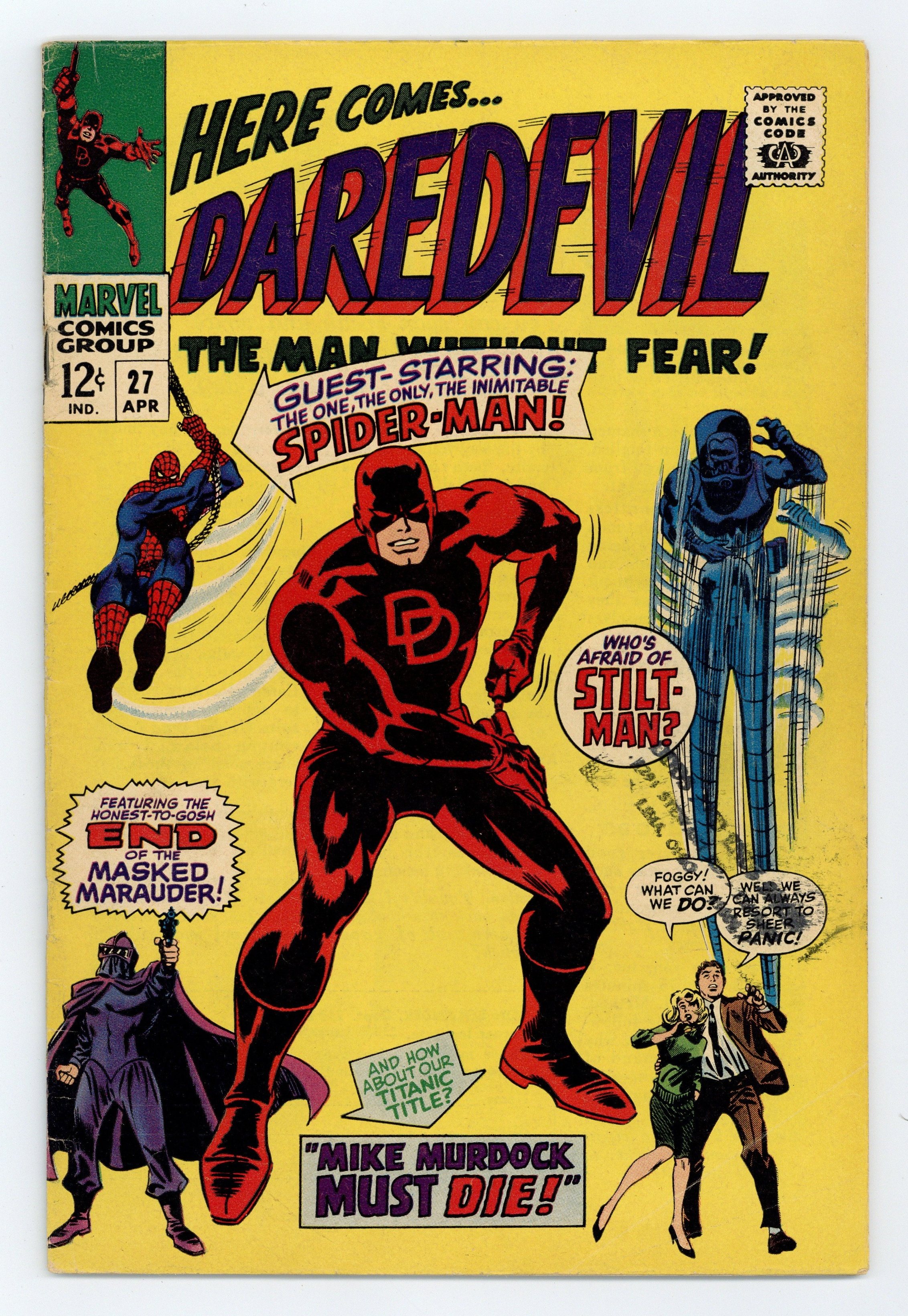 Cover pencils by Gene Colan, inks by Frank Giacoia. Spider-Man guest stars in "Mike Murdock Must Die!" Script by Stan Lee, pencils by Gene Colan, inks by Frank Giacoia; The Marauder kidnaps Foggy, Karen and Matt to force them to reveal DD's secret ID; While a blazing battle takes place aboard the Marauder's helicopter, Spidey runs up against Stilt-Man. Letter to the editor from comics letterer Tom Orzechowski. 36 pgs. Cover price $0.12. Cover price $0.12.