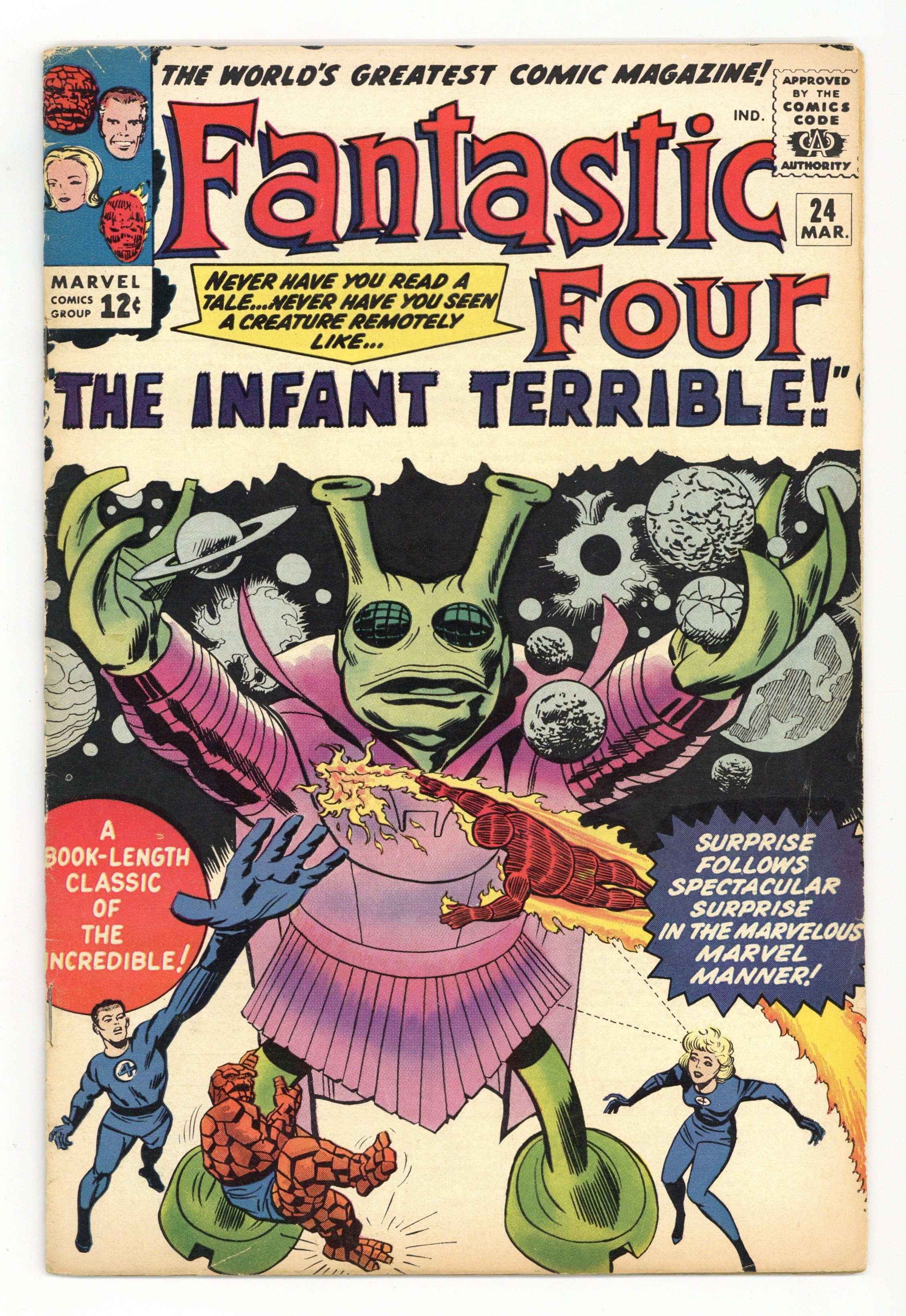 Cover pencils by Jack Kirby, inks by George Roussos. The Infant Terrible!, script by Stan Lee, pencils by Jack Kirby, inks by George Roussos [as Geo. Bell]; An extra-terrestrial wreaks havoc in New York City, until Reed deduces that it is an infant and summons its parents. Letter to the editor from writer Don Glut. 36 pgs. $0.12. Cover price $0.12.