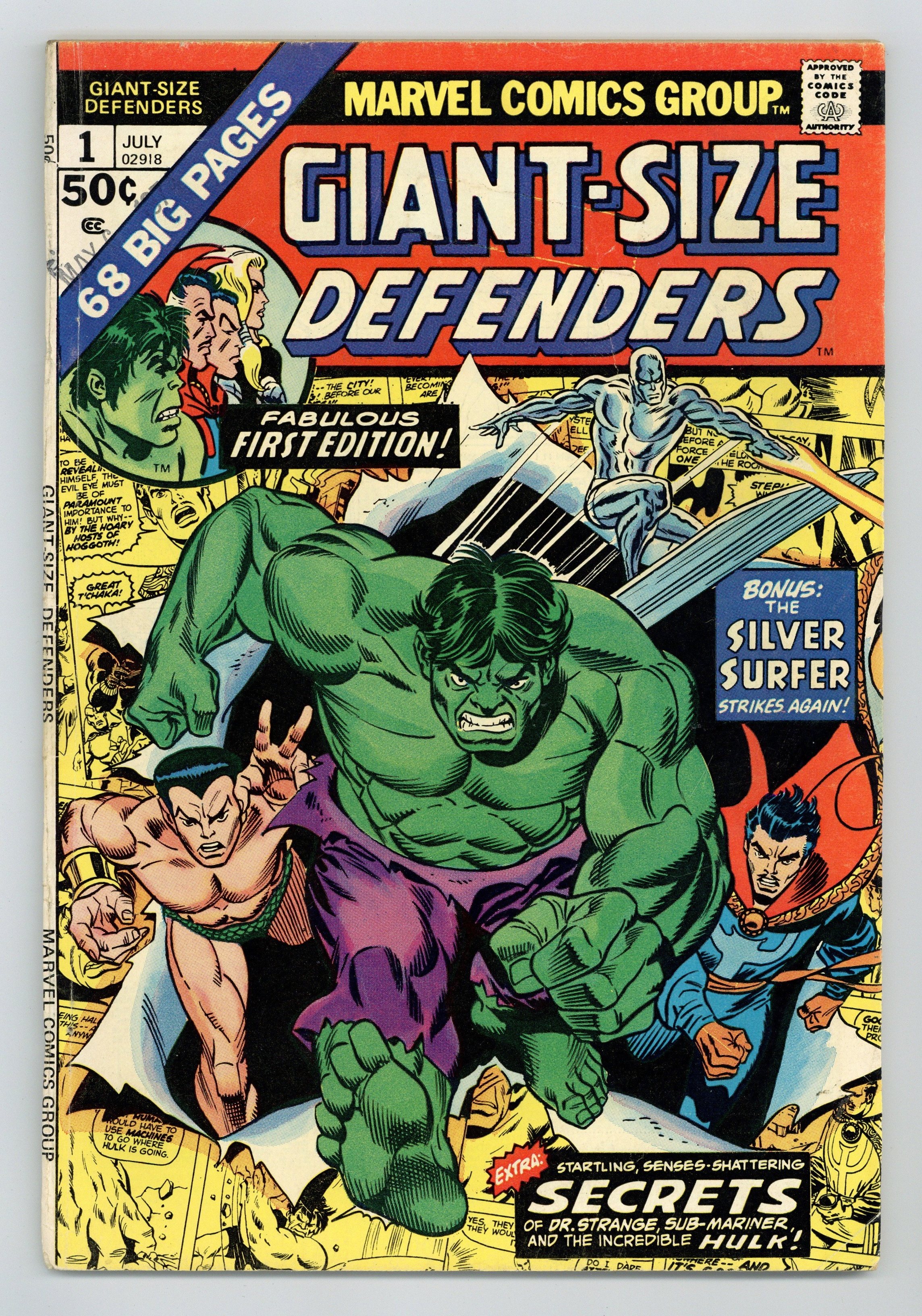 Cover pencils by Gil Kane and John Romita (alterations), inks by Frank Giacoia and John Romita (alterations). New story: "The Way They Were!", script by Tony Isabella, pencils by Jim Starlin, inks by Al Milgrom; Valkyrie learns the origins of the Hulk, Namor and Dr. Strange and the Defenders stop Rasputin. Reprints: "Banished to Outer Space", script by Stan Lee, pencils by Jack Kirby, inks by Dick Ayers; The military captures Rick and Ross convinces him that they need the Hulk to test a new experimental rocket for national security; Rick tricks the jade giant into the capsule but once it is shot into space, he realizes that Ross deceived him to get rid of his foe. Bird of Prey! starring Sub-Mariner and Princess Fen, script and art by Bill Everett. "To Catch a Magician!" starring Doctor Strange and Mr. Rasputin, script by Steve Ditko (plot) and Denny O'Neil (dialogue), art by Steve Ditko. "The Peerless Power of the Silver Surfer," script by Stan Lee, pencils by Jack Kirby; inks by Frank Giacoia; featuring Quasimodo. The Dynamic Defenders! illustration by Sal Buscema. 68 pgs., full color. $0.50. Cover price $0.50.