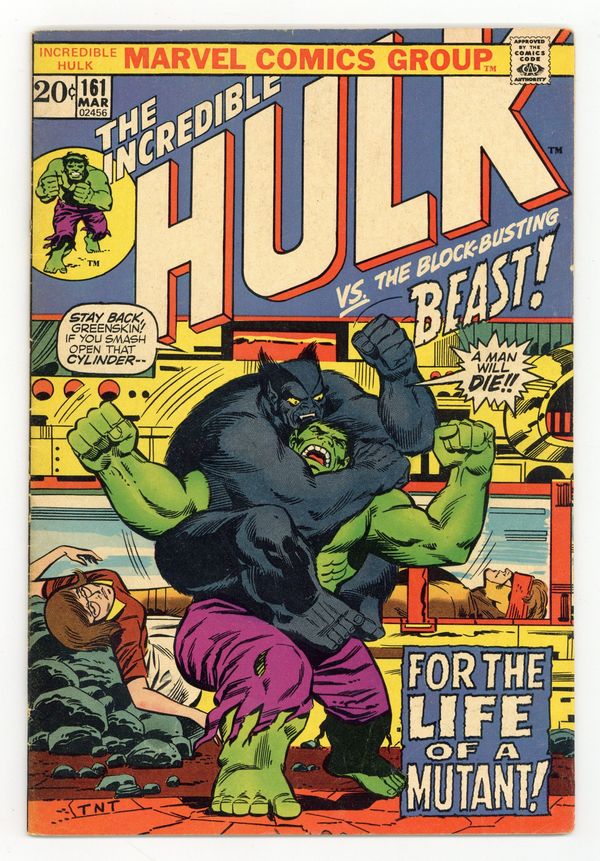 Cover pencils by Herb Trimpe, inks by Sal Trapani. Beyond the Border Lurks Death!, script by Steve Englehart, pencils by Herb Trimpe, inks by Sal Trapani; The Hulk stumbles across a remote cabin in Canada where Hank McCoy is trying to cure the Mimic of a condition which is making his powers go out of control. The heroes fight, and Mimic temporarily absorbs the gamma radiation out of the Hulk, turning him back to Banner, but killing Mimic in the process. 36 pgs. $0.20. Cover price $0.20.