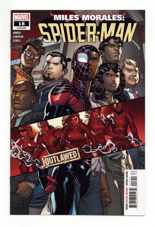 Written by Saladin Ahmed. Art by Carmen Nunez Carnero. Cover by Javi Garron. Ganke. Barbara. Judge. Lana. Mr. Sumida. Rio. Jeff. Miles knows he has to help people as Spider-Man, so he's ready to live as an outlaw. But is he ready to do it without the support of someone he loves? Who's with Miles, who's against him, and who's side are YOU on? 28 pages, full color. Rated T Cover price $3.99.