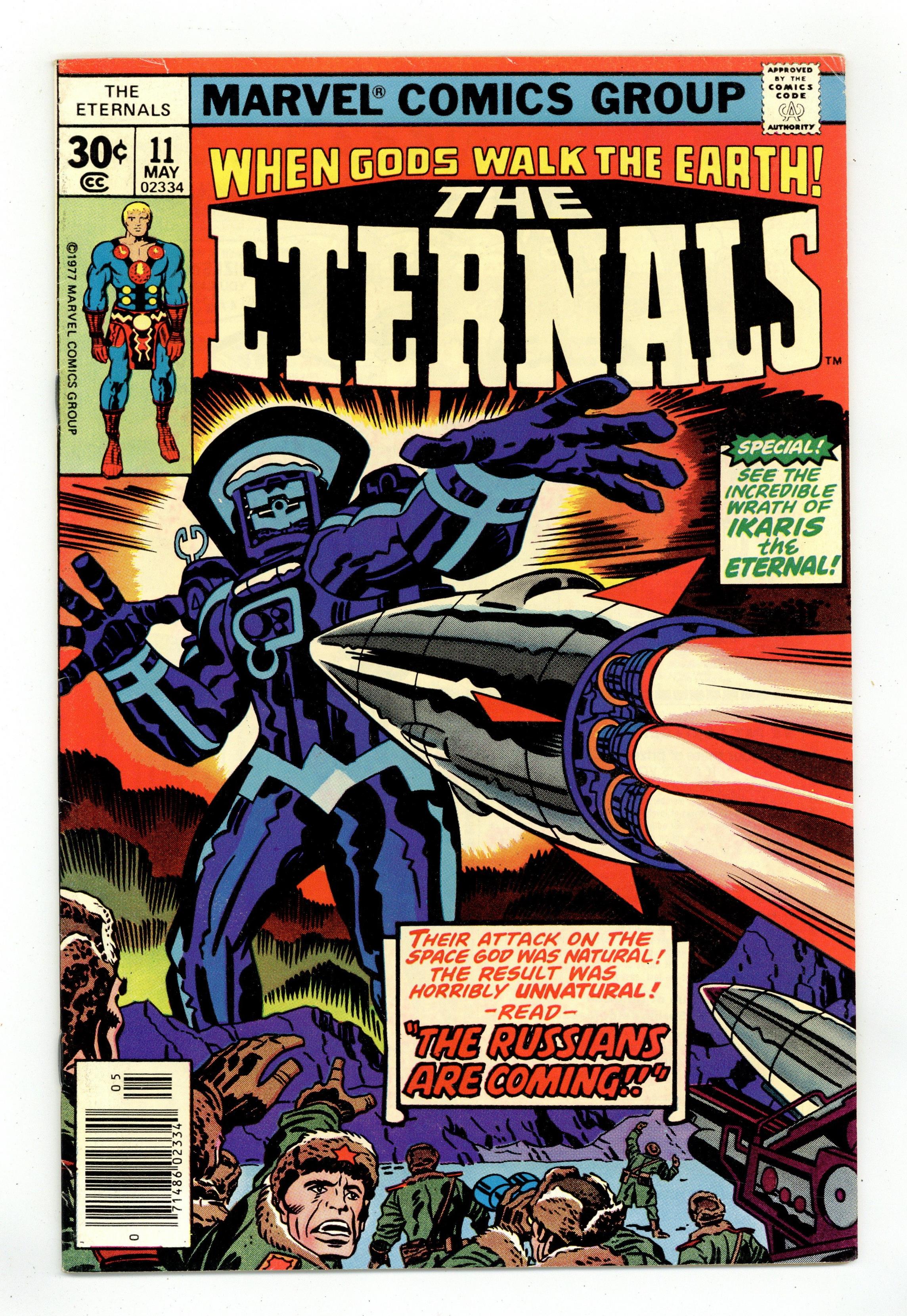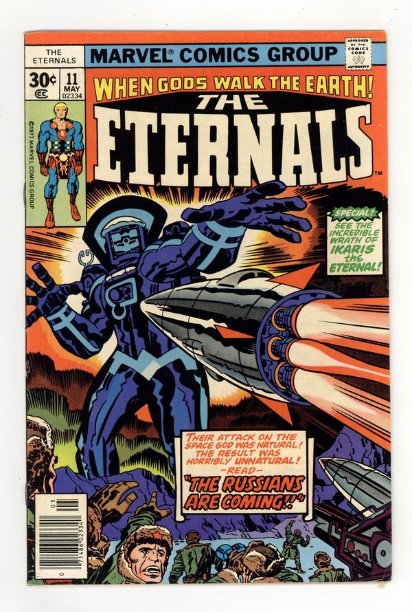 "The Russians Are Coming!" Written by Jack Kirby. Pencils by Jack Kirby. Inks by Mike Royer. The U.S.S.R., frightened by the sudden appearance of the space gods, launches an all-out nuclear assault. Their attack on the space god was natural! The result was horribly unnatural. Notes: Letter to the editor from comics writer Mike Barr. First appearance of Aginar, the Delphan Brothers, Druig, Kingo Sunen, Valkin, and Zarin. Cover price $0.30.