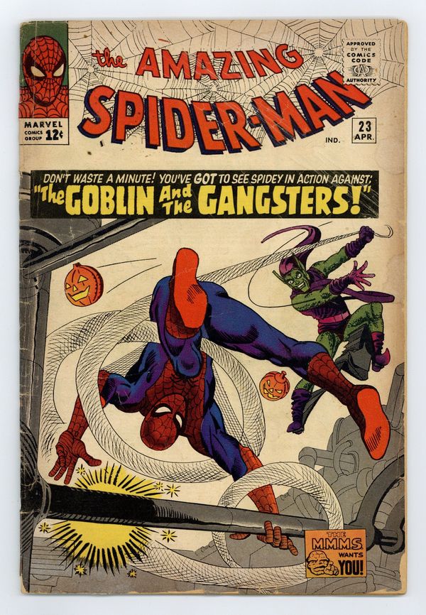 Cover art by Steve Ditko. The Goblin and the Gangsters, script by Stan Lee, art by Steve Ditko; the Green Goblin returns and wants to take over Lucky Lobos mob; Spidey battles Lucky Lobo and his gang; Spidey fights the Green Goblin in a factory. Reprinted in Marvel Tales # 18 and 161. Letter from Jim Shooter, former editor-in-chief at Marvel, critiquing Marvel's handling of Spider-Man. 36 pgs. $0.12. Cover price $0.12.