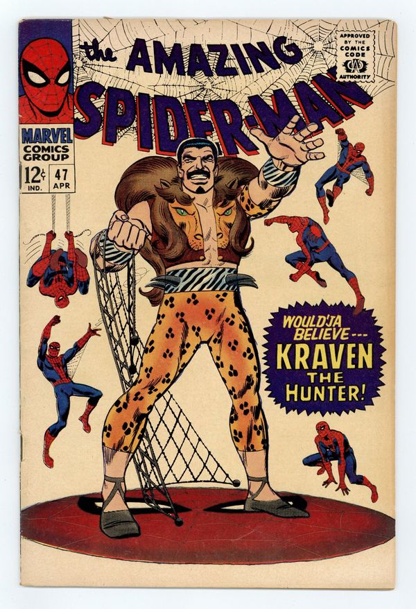 Tags: Marvel Legacy Numbering: Amazing Spider-Man (part 47), Spider-Man$100.00Cover by John Romita Sr. "In the Hands of the Hunter," script by Stan Lee, art and cover by John Romita Sr.; Kraven the Hunter wants cash from Norman Osborn for attacking Spider-Man; since Norman is out of town, Kraven kidnaps Norman's son, Harry, at a party; Spider-Man appears, and he and Kraven fight, but when Norman shows up he can't remember who Kraven is, so doesn't pay him the money; Kraven escapes while Spidey saves Norman. Reprinted in Marvel Tales # 33 and 187. 36 pages, full color. Cover price $0.12.