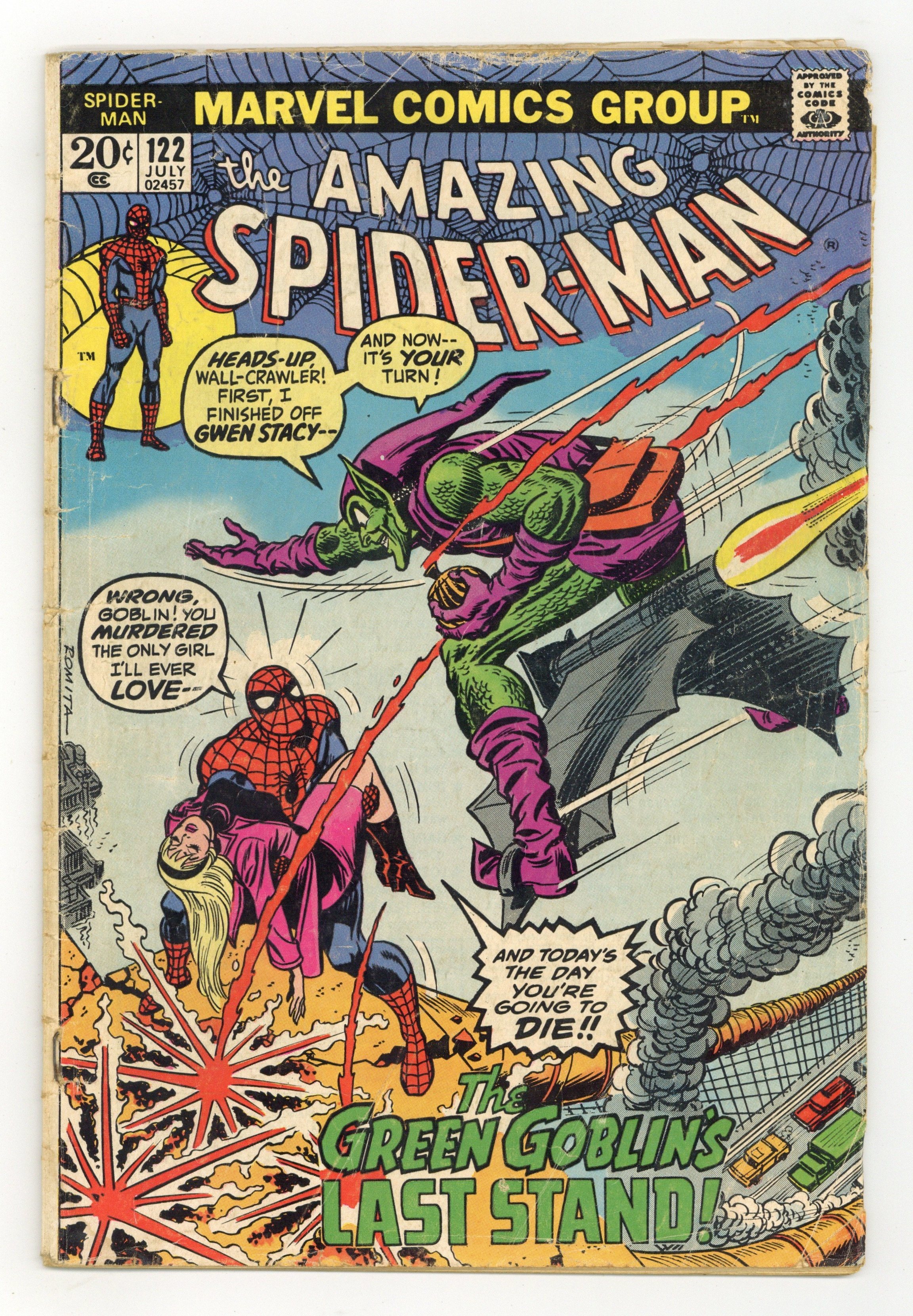 Death of the Green Goblin (aka Norman Osborn) in "The Goblin's Last Stand!" Part 2 of 2. Script by Gerry Conway. Pencils by Gil Kane. Inks by John Romita and Tony Mortellaro (backgrounds). Cover by John Romita. In unfathomable fashion atop the Brooklyn Bridge, Gwen Stacy perished at the hands of the Green Goblin. Spider-Man is devastated. And he furiously lashes out at the goblin, but the purple and green-clad killer gets away! However, a while later, the wall-crawler receives a tip from Joe Robertson about Norman Osborn's whereabouts. And in an abandoned and decrepit warehouse, the Amazing Spider-Man and the Green Goblin fight for the final time! At the end of their epic battle, Peter Parker painfully realizes that revenge is bittersweet. The passing of the goblin won't bring back Gwen. He must find a way to move forward with his life. Perhaps Mary Jane Watson will help. Cameo appearances by Harry Osborn and J. Jonah Jameson. (Notes: The stunning death scene of the Green Goblin inspired a similar moment in the2002 Spider-Man movie. This issue was reprinted in Marvel Tales #99 and again in issue 192.) 36 pages. Cover price $0.20.