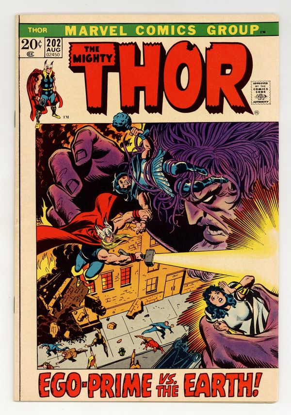 Tags: Marvel Legacy Numbering: Thor (part 202), Thor$16.00Cover pencils by John Buscema, John Romita (alterations), and Marie Severin (alterations), inks by John Romita (alterations) and Marie Severin (alterations). "And None Dare Stand 'Gainst Ego-Prime!", script by Gerry Conway, pencils by John Buscema, inks by Vince Colletta; Ego-Prime has come to Earth, and not all the Asgardian's power can stop him; Meanwhile, Heimdall finds one of the people in his quest - Jackson Kimbal. Appearances by Sif, Hogun, Fandral, Volstagg, Karnilla, Hildegarde, Heimdall, and Odin. 36 pgs., full color. $0.20. Cover price $0.20.
