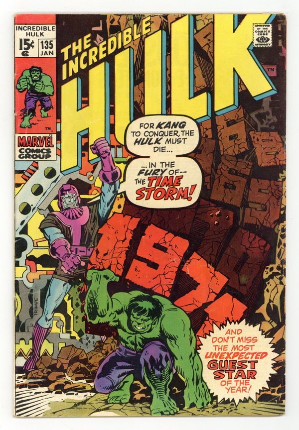 Tags: Marvel Legacy Numbering: Hulk (part 135), Hulk$16.50Cover art by Herb Trimpe. Descent Into the Time-Stream, script by Roy Thomas, pencils by Herb Trimpe, inks by Sal Buscema; Kang plucks Hulk from the present and whisks him back to World War I to stop the Phantom Eagle from accomplishing a mission which will prevent the Avengers and the Hulk himself from ever existing; When the Hulk returns to the present with Kang's plans foiled, he finally reverts back to Bruce Banner. 36 pgs. $0.15. Cover price $0.15.