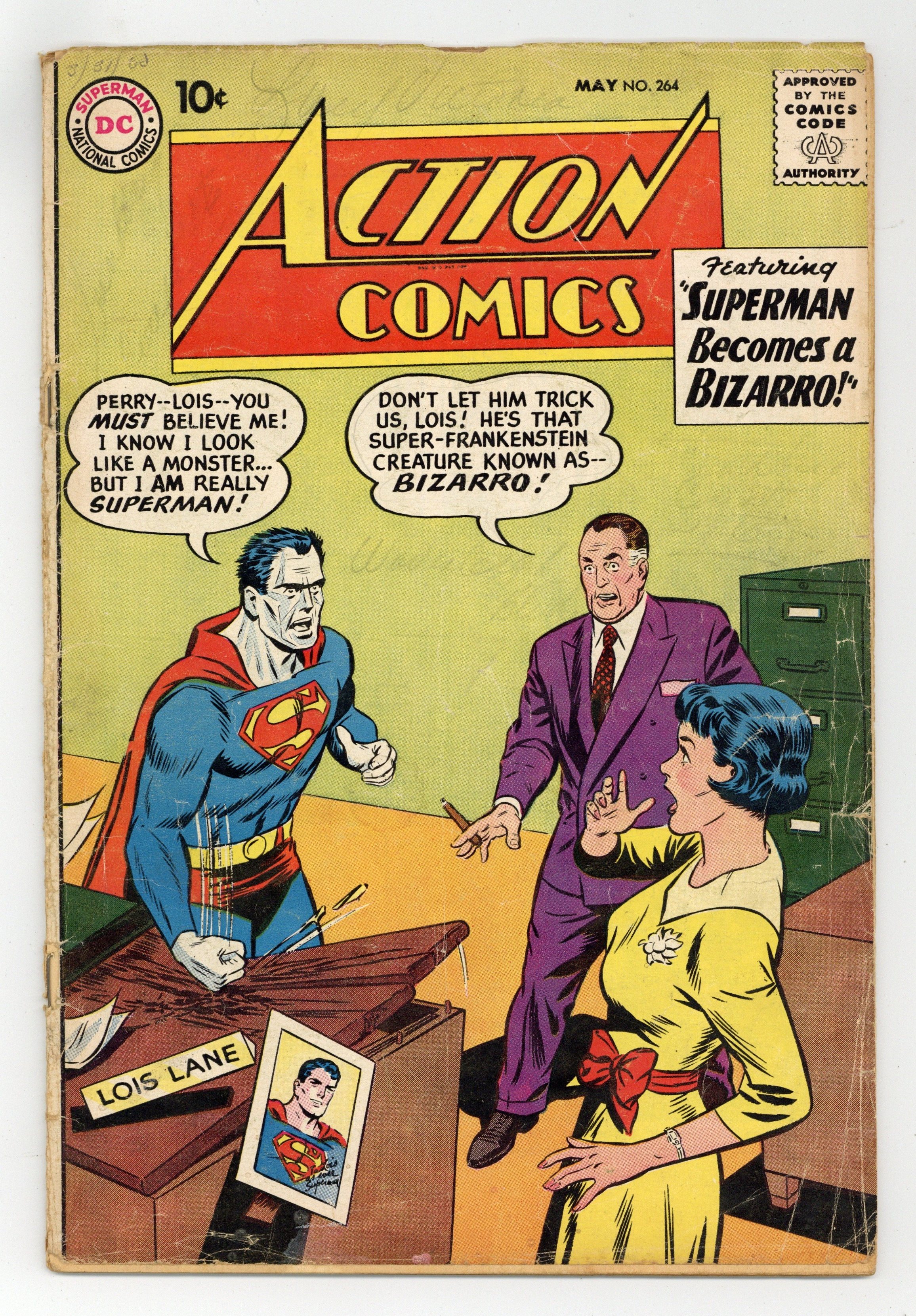 Cover pencils by Curt Swan, inks by Stan Kaye. "The Superman Bizarro!", script by Otto Binder, pencils by Wayne Boring, inks by Stan Kaye; Captured by the Bizarros on Bizarro World, Superman is sentenced to be turned into a Bizarro himself; He dreams what it would be like if the sentence was carried out. 2/3-page Ollie story by Henry Boltinoff. "Supergirl Gets Adopted!", script by Jerry Siegel, art by Jim Mooney; Linda has to scheme to prevent herself from being adopted to protect her secret identity; She spends 30 days with the Wilkins. One-page Professor Eureka story by Henry Boltinoff. 36 Pages, Full Color. $.10 "This is Part 2 of 4 of a running gag of covers that homage each other by legendary Superman artist Curt Swan that ran from 1958 to 1963. It is a series of covers I'm calling "The Desk Smash," and they appeared on the covers for Action Comics #237, 264, 284, and 302." – Odinson, mycomicshop.com Archivist. Cover price $0.10.