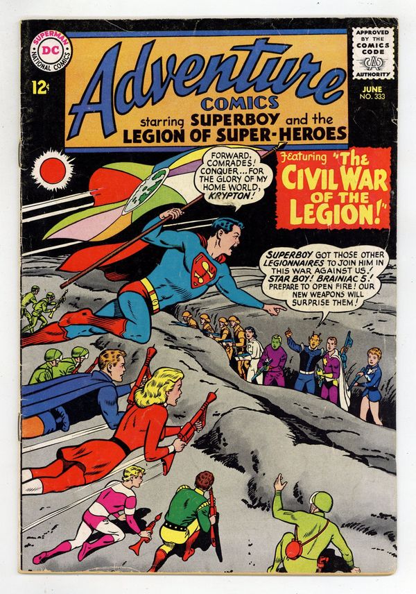 $15.75Cover pencils by Curt Swan, inks by George Klein. Happy Hobby Time! public service announcement starring Superboy, script by Jack Schiff, art by Winslow Mortimer. The War Between Krypton and Earth!--Tales of the Legion of Super-Heroes, script by Edmond Hamilton, pencils by John Forte, inks by George Klein; The Legionnaires travel to the past to find out the story behind an ancient artifact which refers to a war between Earth and Krypton. The Spoiled Superboy, art by Al Plastino. Superboy also stars in a one-page public service announcement, Happy Hobby Time! Rocky and Bullwinkle star in a one-page Cheerios ad. 36 Pages, Full Color. Cover price $0.12.