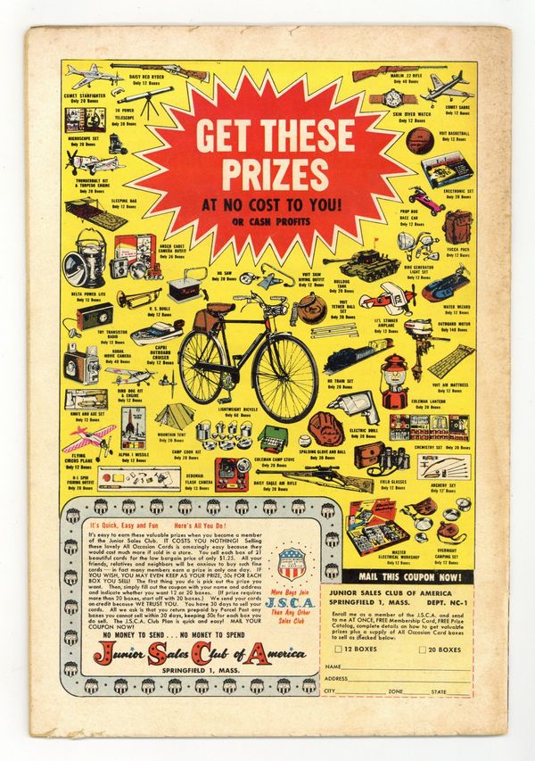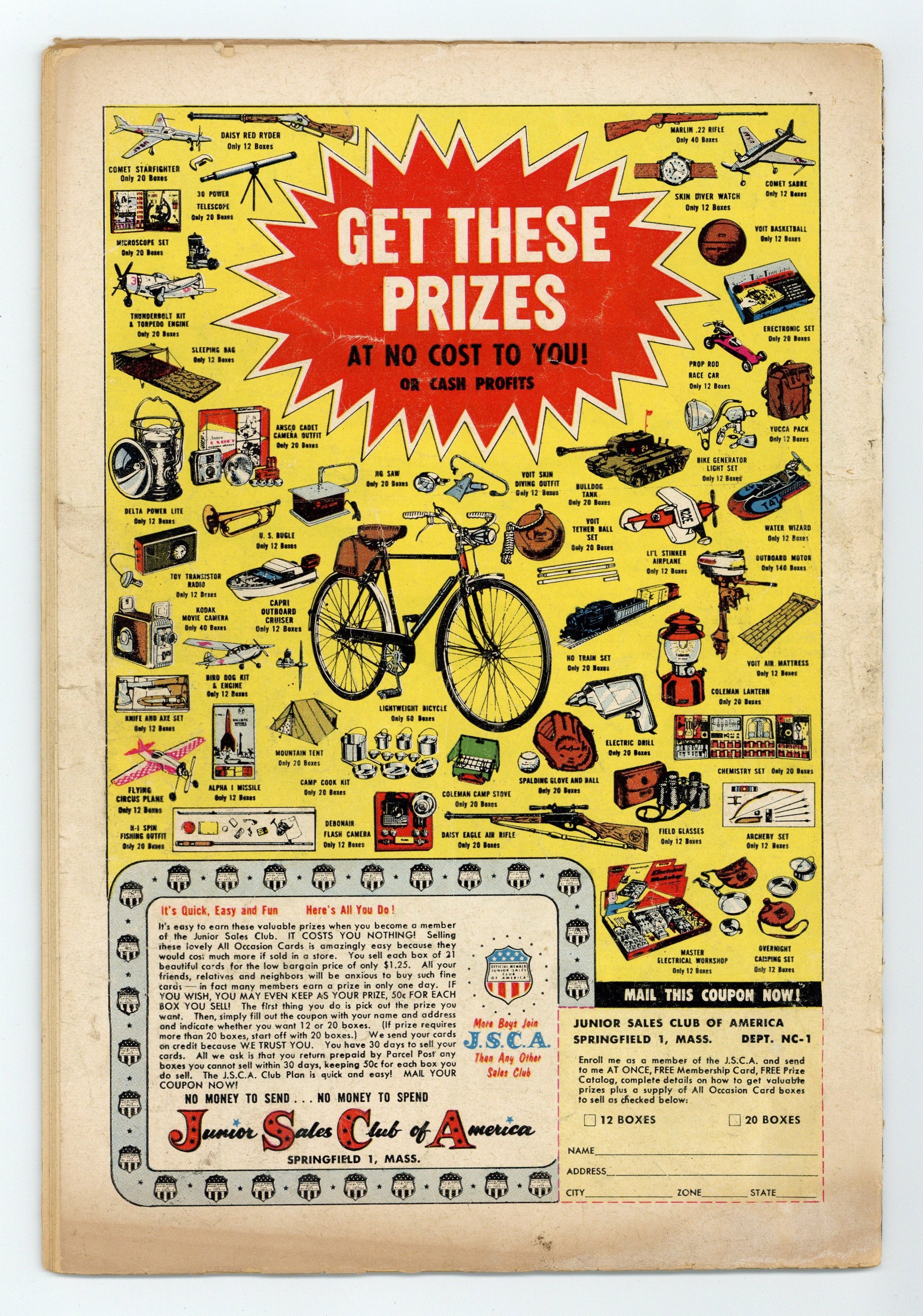 Ends Apr 13 7:29 PM CST Bid History 4 bids Current Bid $12 Your Secret Max Bid If you'd like to bid, please log in or register. Cover pencils by Curt Swan, inks by Stan Kaye. "Prisoners of the Sargasso Sea," script by Bill Finger, pencils by Sheldon Moldoff, inks by Charles Paris; While chasing a modern-day pirate, Blackjack, Batman and Robin are marooned in the Sargasso Sea; There they discover others who have been trapped for centuries by the seaweed and its strange, age-defying gas. Detective Comics #265 ad. One-page Strange Old Laws story by Henry Boltinoff. "The Cross Country Crimes!", script by Bill Finger, pencils by Sheldon Moldoff, inks by Charles Paris; Batman and Robin foil Hijack and his gang, who have been robbing trucks of Carter trucking, including one containing platinum. "Double-Dealer in Diamonds" text story. One-page Warden Willis story by Henry Boltinoff. The Family Favorite! public service announcement, art by Bernard Baily. "The Marriage of Batman and Batwoman," script by Bill Finger, pencils by Sheldon Moldoff, inks by Ray Burnley; Dick Grayson goes to sleep while Bruce is out on a date with Kathy, and dreams of the loss of their secret identities caused by Bruce's and Kathy's marriage. 36 Pages, Full Color. Cover price $0.10.