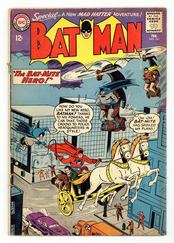 Cover art by Sheldon Moldoff. "The New Crimes of the Mad Hatter," script by Dave Wood, pencils by Sheldon Moldoff, inks by Charles Paris; The Mad Hatter pulls a string of robberies based on the professions of the jurors that sentenced him on his last arrest. Special Christmas Quiz -- "Christmas in Many Lands!" public service announcement, art by Ruben Moreira. "The Bat-Mite Hero," script by Dave Wood, pencils by Sheldon Moldoff, inks by Charles Paris; Batman corners a wanted felon in a baseball stadium, but Bat-Mite appears and messes things up with his magical nonsense. Batman tells him to find another hero to pester, so Bat-Mite creates a series of heroes (the third a crook), but they fail miserably. Half-page Casey the Cop story by Henry Boltinoff. 36 Pages, Full Color. Cover price $0.12.