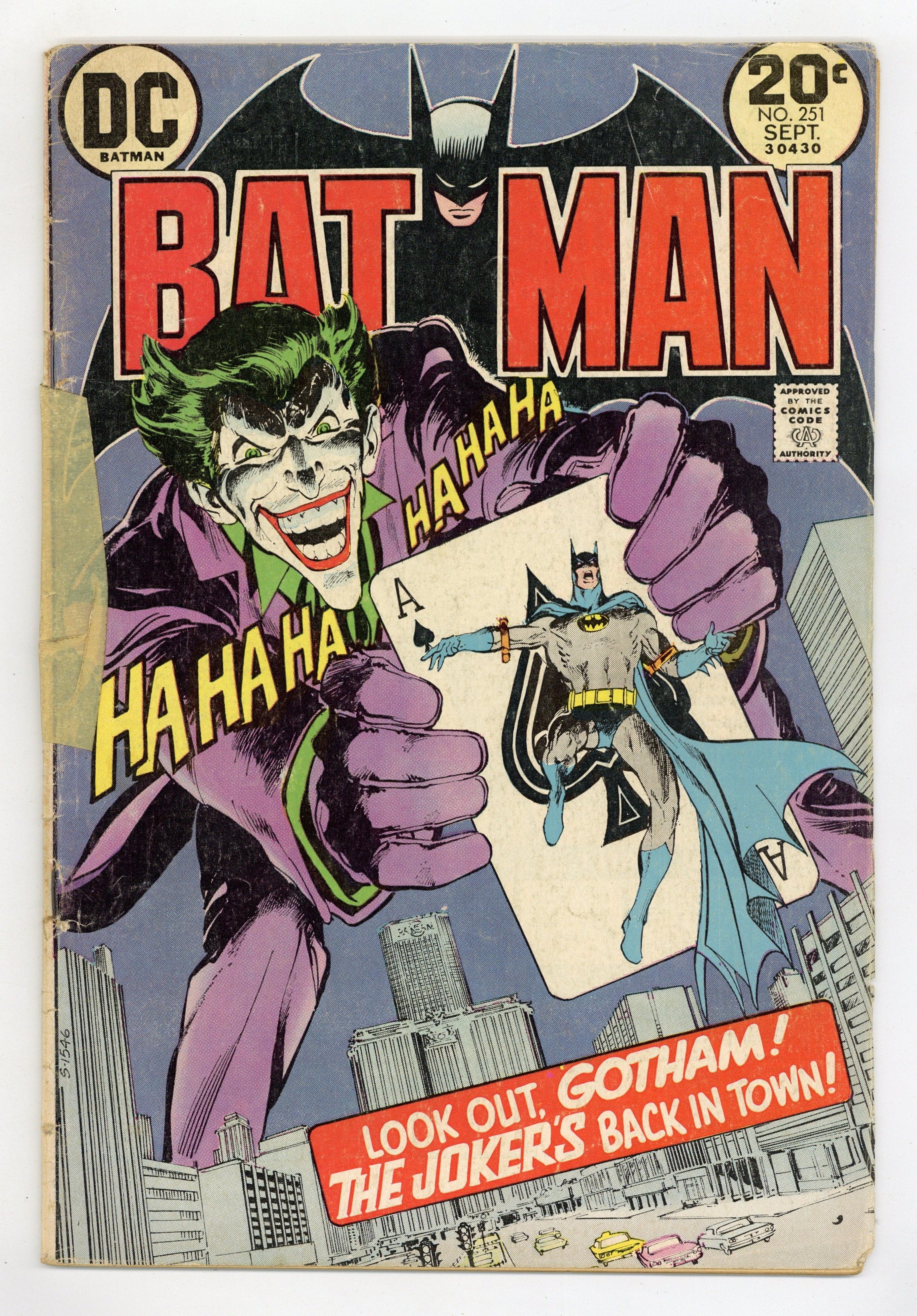 Ends Apr 14 7:50 PM CST Bid History 3 bids Current Bid $206 Your Secret Max Bid If you'd like to bid, please log in or register. Cover art by Neal Adams. "The Joker's Five-Way Revenge!", script by Denny O'Neil, art by Neal Adams; The Joker has set himself free from the Mental Hospital for the Criminally Insane Batman had him incarcerated in, and he is out for blood; Before he was sent away, knowing that one member of his previous gang had ratted him out to the police, he had vowed to murder all five of them; And only the Batman is capable of stopping him; Despite Batman's best efforts, the Joker is able to finish off nearly all of his hit list; Batman is only alerted after the first murder, when a grinning corpse is found in the mud just outside of Gotham City, and he goes to each of the former members of the Joker's gang individually to try to protect them. Plop! comic book ad. Champion Sports comic book ad. 36 Pages, Full Color. Cover price $0.20.