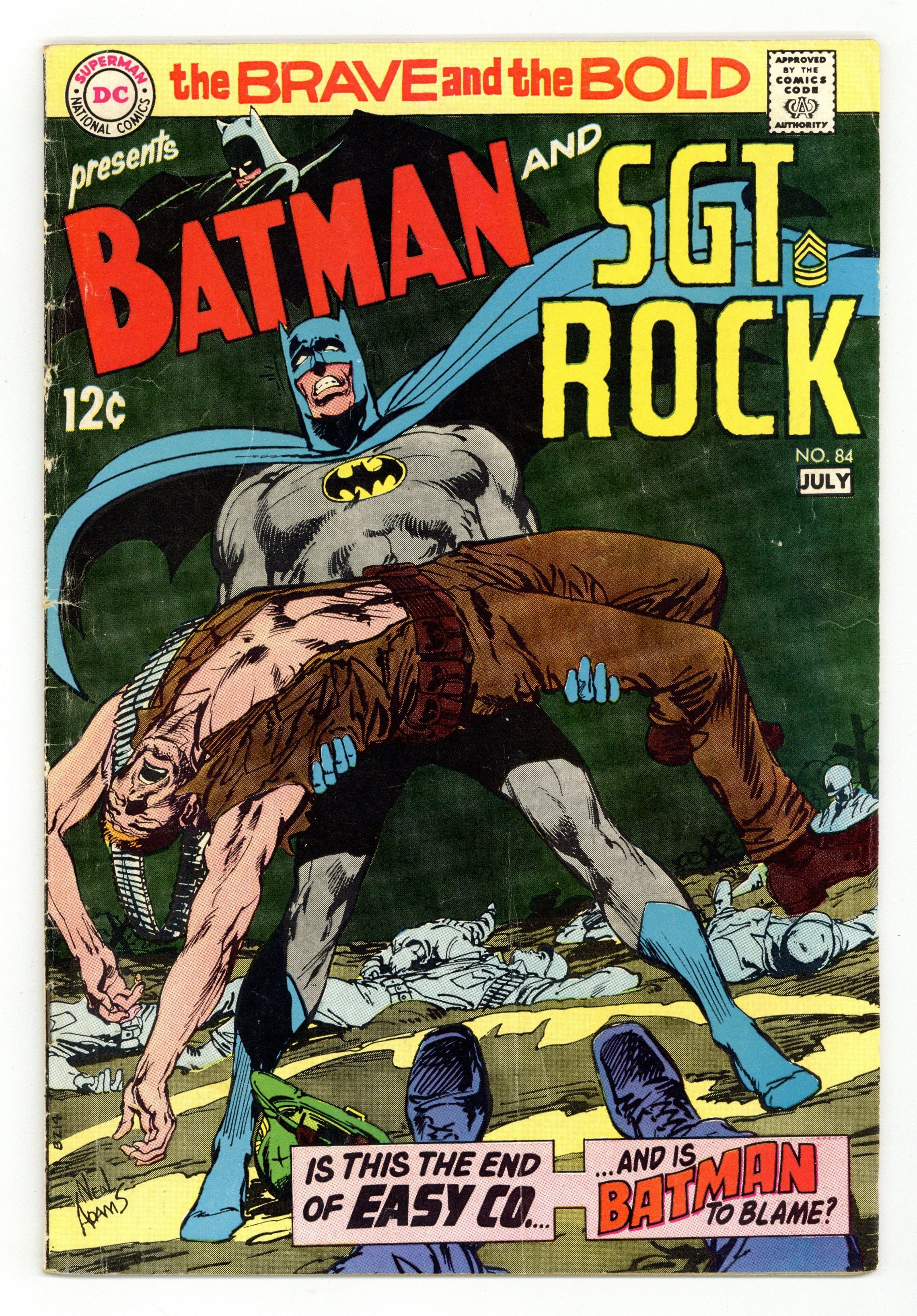 Last 12-cent cover price. Cover by Neal Adams. "The Angel, the Rock and the Cowl," script by Bob Haney, pencils by Neal Adams, inks by Neal Adams and Joe Kubert (page 19); When Bruce Wayne is called to the Gotham Museum to see the statue of the Archangel Gabriel smuggled out of Nazi-occupied France during World War II, because a man with a German accent called about it called to claim it; Bruce informs him that the real statue is still in France and the one in Gotham is a fake; They are then attacked by a man Bruce recognizes as Von Stauffen; Bruce then recalls back to a day during World War II, when he was in London, and his friend, a British spy named Digby is killed in a bombing and so Bruce covered his mission for the British forces; Traveling into Nazi occupied France, Bruce meets up with Sgt. Rock and Easy Company along the way; Investigating a strange amount of wine coming out of Chateaurouge, Bruce learns that it's occupied by Nazi's led by Von Stauffen; As a spy, Bruce is unable to learn what the secret is behind the wine, so he tries as Batman and comes to blows with Rock and Easy Company again who happen to be in the area. 36 Pages, Full Color. Cover price $0.12.