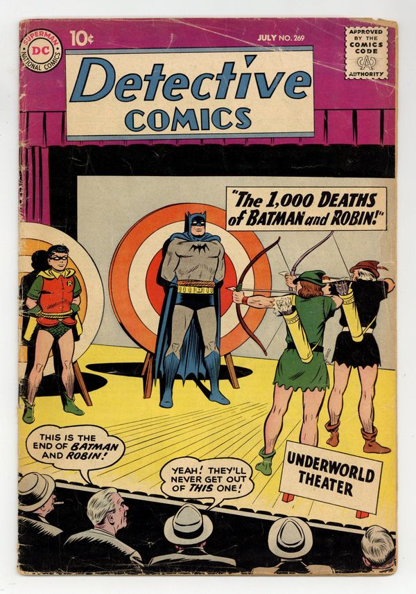 Cover pencils by Curt Swan, inks by Stan Kaye. "The Thousand Deaths of Batman!" starring Batman and Robin, pencils by Sheldon Moldoff, inks by Charles Paris; A criminal director, for a price, stages plays for the underworld in which Batman and Robin actors are "killed," until the real Batman and Robin take the crook-actors places; After a few performances, the director becomes suspicious and finally learns the truth; During the night in which the leader of the gangsters is among the audience, the director has prepared deadly traps on stage to eliminate the Dynamic Duo. Warden Willis two-page humor by Henry Boltinoff. "The Menace of the Magnetic Meteorite!" starring Roy Raymond TV Detective, art by Ruben Moreira; Roy vs. Borgal. Half-page Casey the Cop story by Henry Boltinoff. "The Man Who Exposed John Jones" starring John Jones Manhunter from Mars, art by Joe Certa; A former film executive is operating a blackmail racket, and he thinks he can blackmail Detective Jones with proof he is a Martian. 36 pgs., full color. Cover price $0.10.