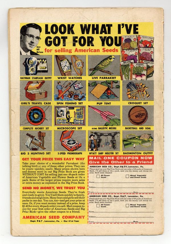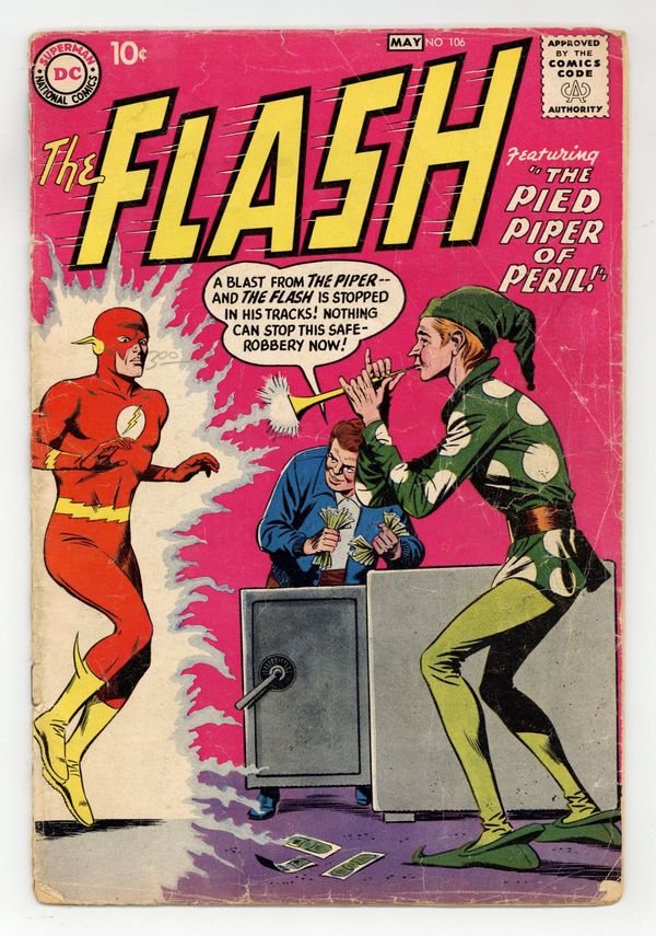 Cover pencils by Carmine Infantino, inks by Joe Giella. Origin Grodd & Pied Piper. This is Flash's first visit to Gorilla City; begin Grodd the Super Gorilla trilogy. This book is listed as scarce in Overstreet. Menace of the Super-Gorilla!, script by John Broome, pencils by Carmine Infantino, inks by Joe Giella; Fred Pearson, star of the Central City Theatre's "The Great Gorilla" and friend of Barry Allen's, has been having blackouts, at the same time that a mysterious gorilla has been seen roaming Central City. The Brave and the Bold #23 ad. What's Your B.Q.*? (*Brotherhood Quotient) public service announcement, script by Jack Schiff, pencils by Bernard Baily. Flash Facts filler page. The Menace of the Super-Gorilla - Conclusion; Gorilla Grodd is the pilot of the super-sonic vehicle, and he has come to Central City to find Solovar, who is playing captive in the Central City Zoo. Comparative Speed Records fact page. Amazing Apes article. The Pied Piper of Peril!, script by John Broome, pencils by Carmine Infantino, inks by Joe Giella; Barry is on time for a dinner date with Iris for the first time, but he has to run out to deal with the Piper, the self-acclaimed Master of Sound. 36 Pages, Full Color. Cover price $0.10.