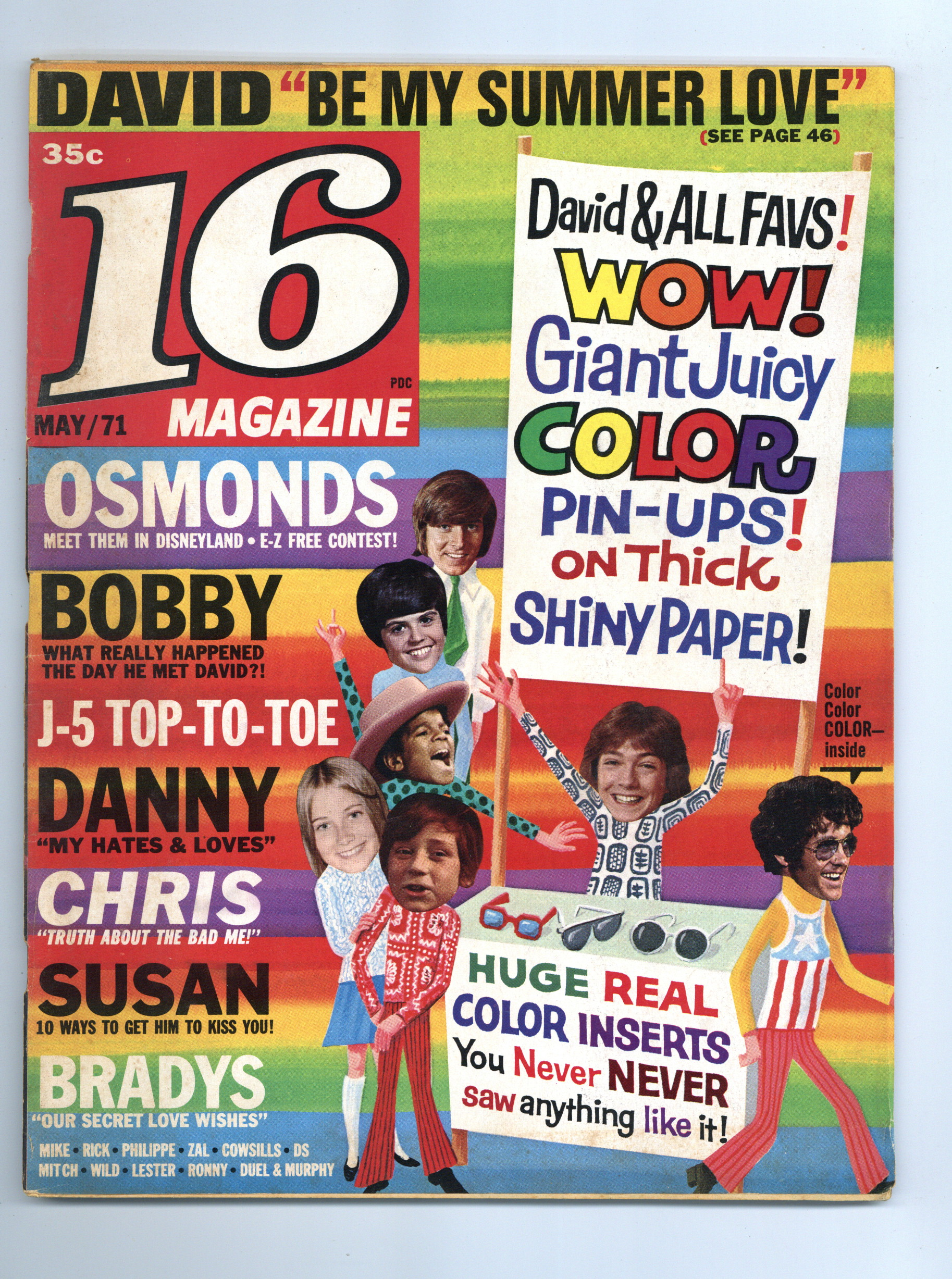 May 1971. Fan magazine aimed at teenage girls. Coverage of David Cassidy and The Partridge Family, The Osmonds, Bobby Sherman, and more. 8.25" x 11". 64 pages. Black and white with a few full-color pages. Cover price $0.35.