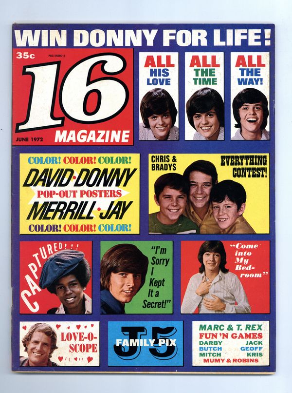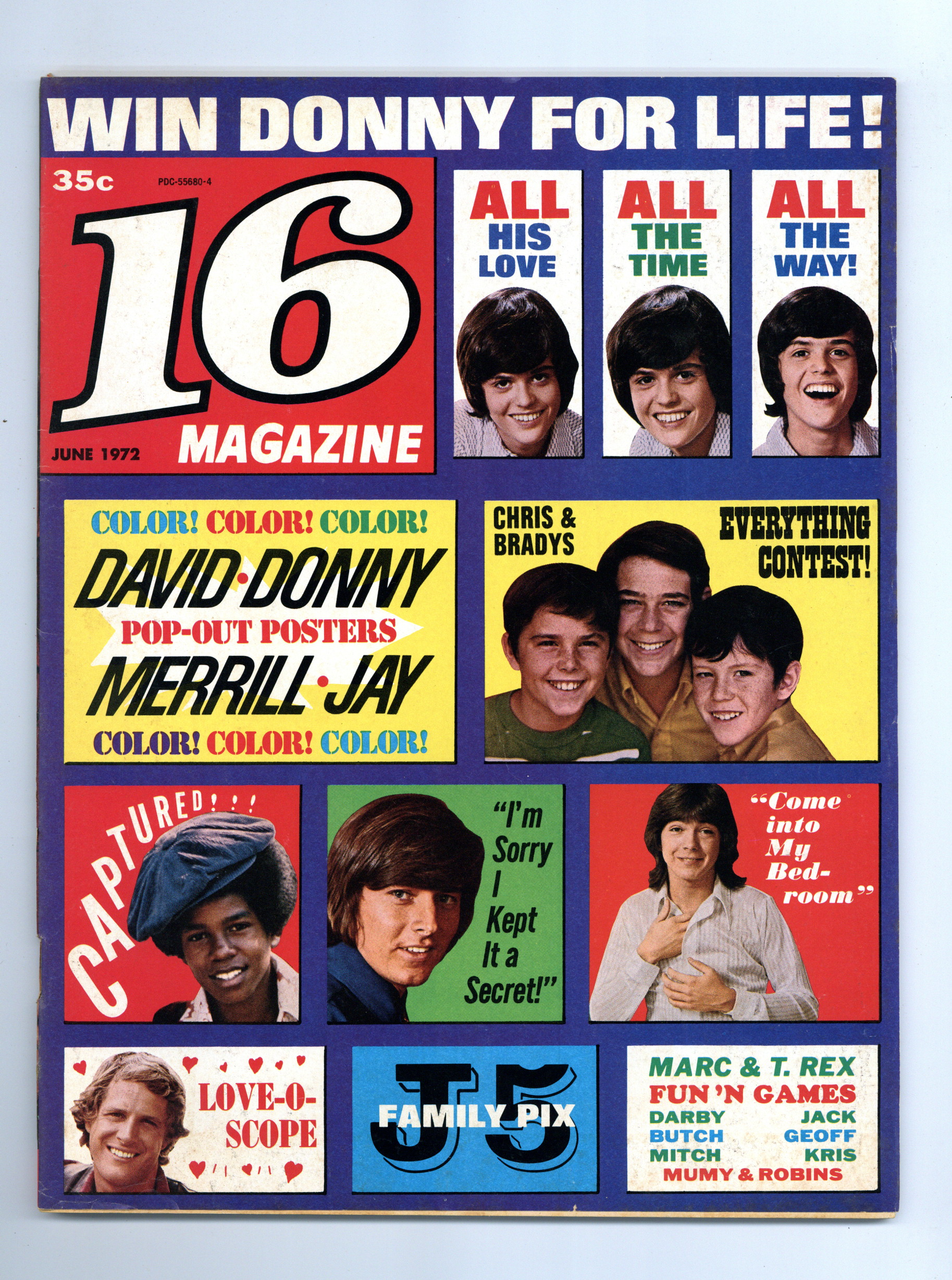 June 1972. Fan magazine aimed at teenage girls. Coverage of David Cassidy and The Partridge Family, The Osmonds, Bobby Sherman, and more. 8.25" x 11". 66 pages. Black and white with a few full-color pages. Cover price $0.35.