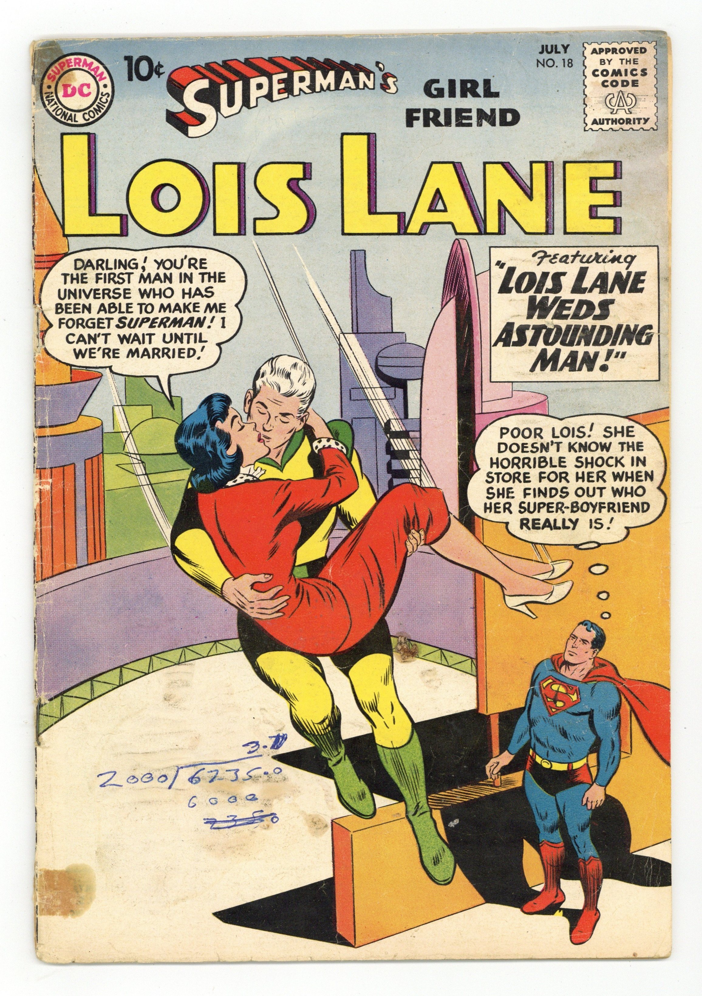 Cover pencils by Curt Swan, inks by Stan Kaye. The Star Reporter of Metropolis!, art by Kurt Schaffenberger; Lois befriends a young girl who wants to be a reporter but soon she's being out-scooped. House ad for Many Loves of Dobie Gillis #2. The Sleeping Doom!, script by Robert Bernstein, art by Kurt Schaffenberger; Lois Lane must stay awake until Superman returns from space or she will be taken over by an alien being. Lois Lane Weds Astounding Man!, pencils by Al Plastino; An alien superman comes to Earth and asks Lois to marry him. 36 Pages, Full Color. Cover price $0.10.