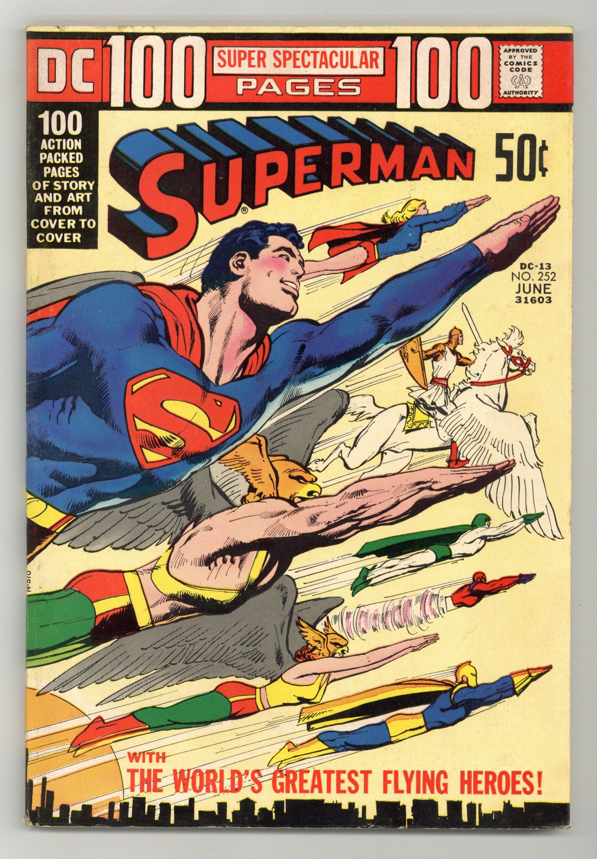 A great Neal Adams wrap-around classic cover featuring 21 super heroes in dynamic flight gets this beautiful 100-page giant off to a soaring start (see inside back cover for cover key/diagram and cool info about each hero). The lead off story, "Powerstone!" is a Superman reprint from Action #47 (April, 1942) with none other than Luthor as Superman's challenger. Luthor pops up again and faces death in the electric char in "When Titans Clash!" from Superman #17 (July-Aug. 1942). Next up is a great Doctor Fate reprint from More Fun Comics #57 (July, 1940), with Howard Sherman art. Other Golden Age reprints include Hawkman from Flash Comics #24 (Dec. 1942) with art by Sheldon Moldoff; a great Black Condor story from Crack Comics #18 (Nov., 1941) with Lou Fine's top-notch art; a Spectre reprint illustrated by Bernard Baily; a Starman story, "The Menace of the Invisible Raiders!" from Adventure #67 (Oct., 1941) by Jack Burnley; another great Lou Fine illustrated story, this time the Ray from Smash Comics #17 (Dec., 1940); then Superman wraps up the issue in "Superman's Greatest Feats!" from Superman #146 (July, 1961) with art by Al Plastino. 100 Pages, Full Color. Cover price $0.50.