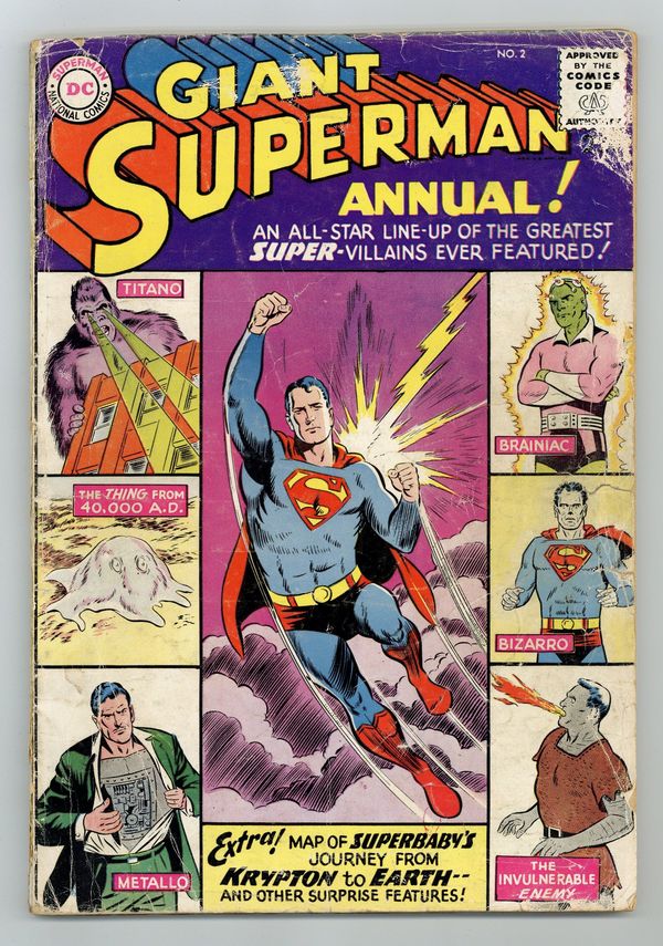 All reprints: "The Invulnerable Enemy," "The Menace of Metallo," "Titano, the Super-Ape," "The Thing From 40,000 A.D.," "The Thing of Steel" (Bizarro origin), "The Runaway Super-Creature," "The Battle With Bizarro," and "The Super-Duel in Space" (Brainiac origin from Action 242). Cover price $0.25.