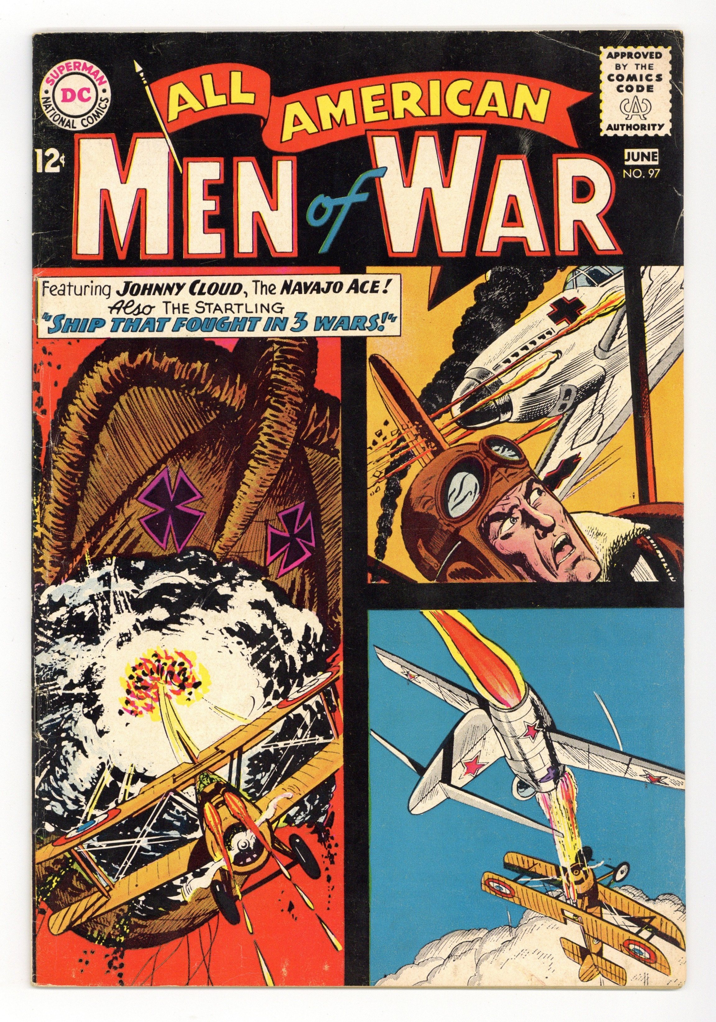 "The Ship That Fought in Three Wars" and Johnny Cloud in "A Target Called Johnny!" Full-page ad for Metal Men #1. Edited by Robert Kanigher. Cover by Irv Novick. Stories by Robert Kanigher and Irv Novick. Adventure tales of war and the military, including some humor—go into combat with All American Men of War! 36 Pages, Full Color. Cover price $0.12.