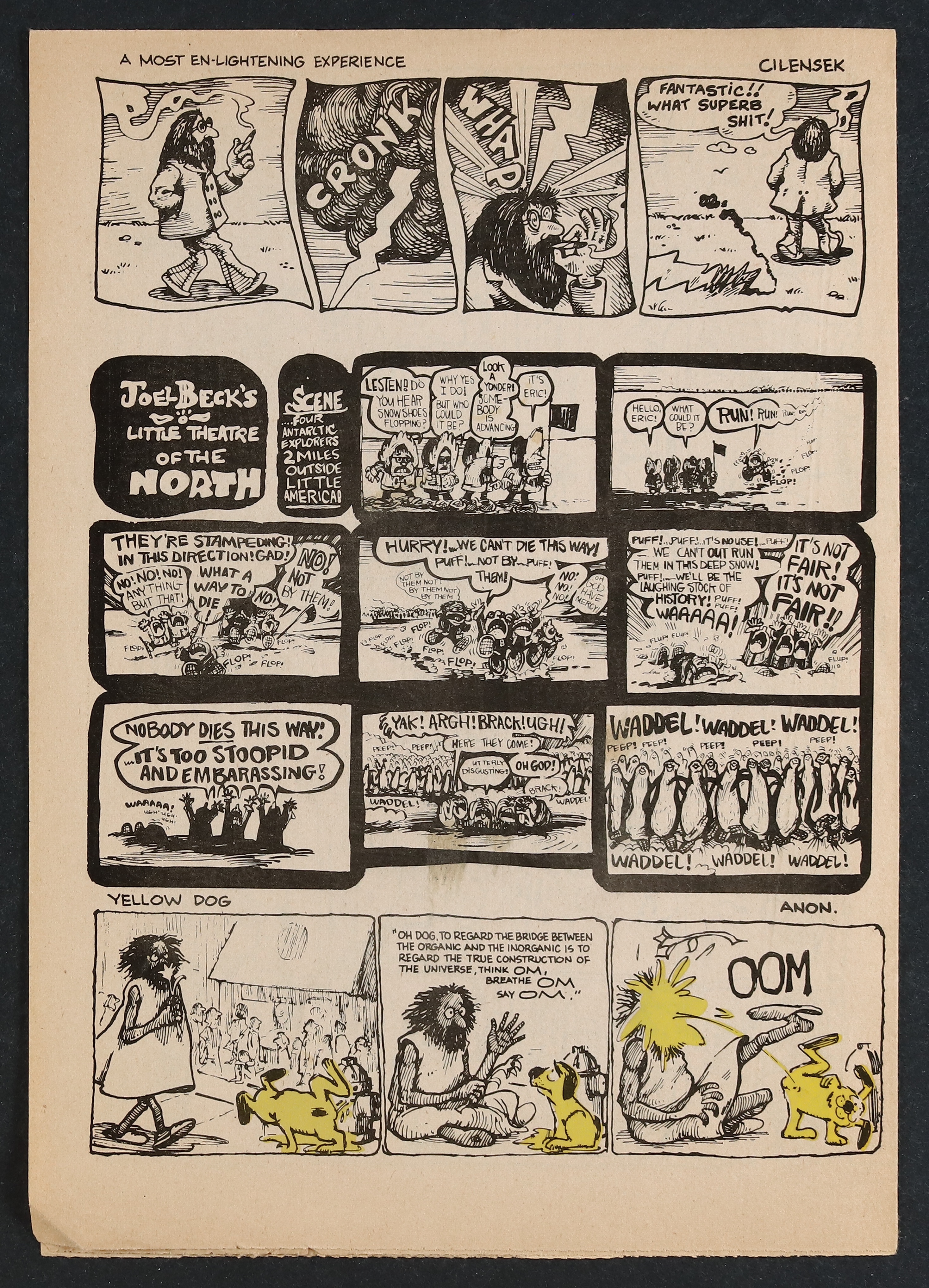 2nd printing. 25¢ cover price. Volume 1, Issue 1. This is the 5th anniversary reprint edition. Originally packaged with issues 1-12 in a sealed envelope. Cover by Robert Crumb. Elsewhere, T, Crumb, Beck, Martin, Thompson, Cilensek, and Gardner. 8-in. x 11 1/2-in., 8 pages, Fold-Out Newspaper Style, PC/PBW, MATURE READERS Cover price $0.25.