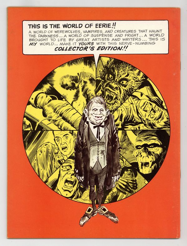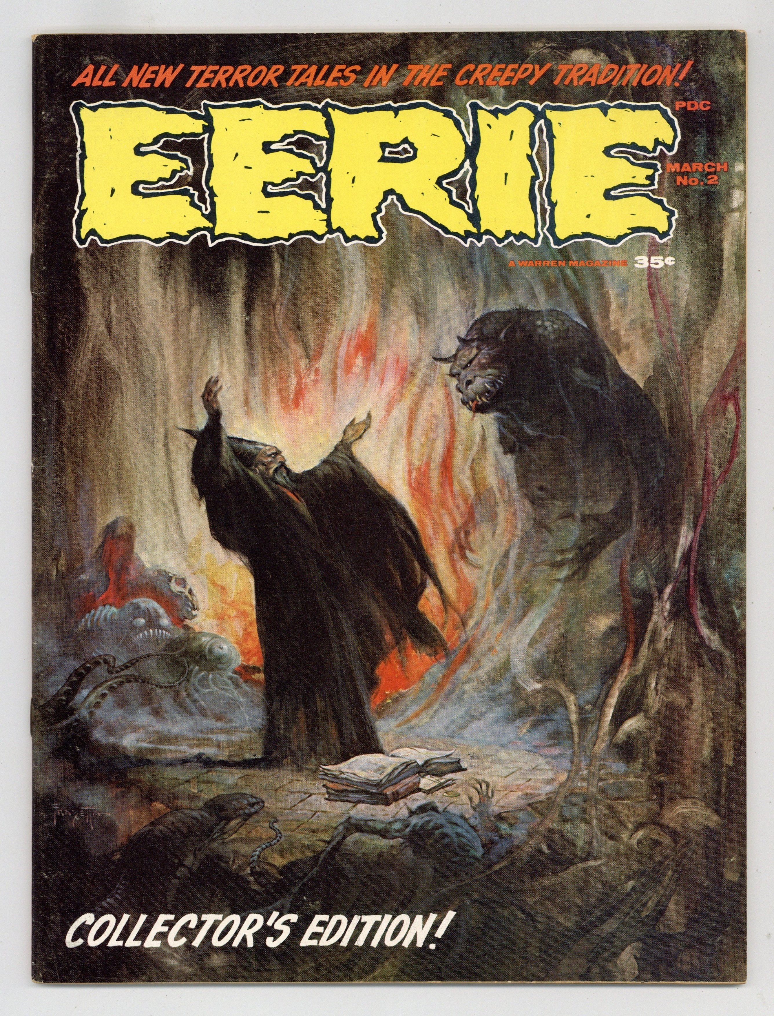 This is the first actual magazine-sized issue of Eerie (the first was an ashcan edition). Stories in this issue include: Footsteps of Frankenstein by Reed Crandall and Archie Goodwin; One for De-Money by Angelo Torres and E. Nelson Bridwell; Eye of the Beholder by Jay Taycee and Archie Goodwin; Flame Fiend by Gray Morrow and Eando Binder; To Pay the Piper by Eugene Colan and Larry Ivie; Vision of Evil by Alex Toth and Archie Goodwin; and Ahead of the Game by Joe Orlando and Archie Goodwin. Cover art by Frank Frazetta. Cover price $0.35.