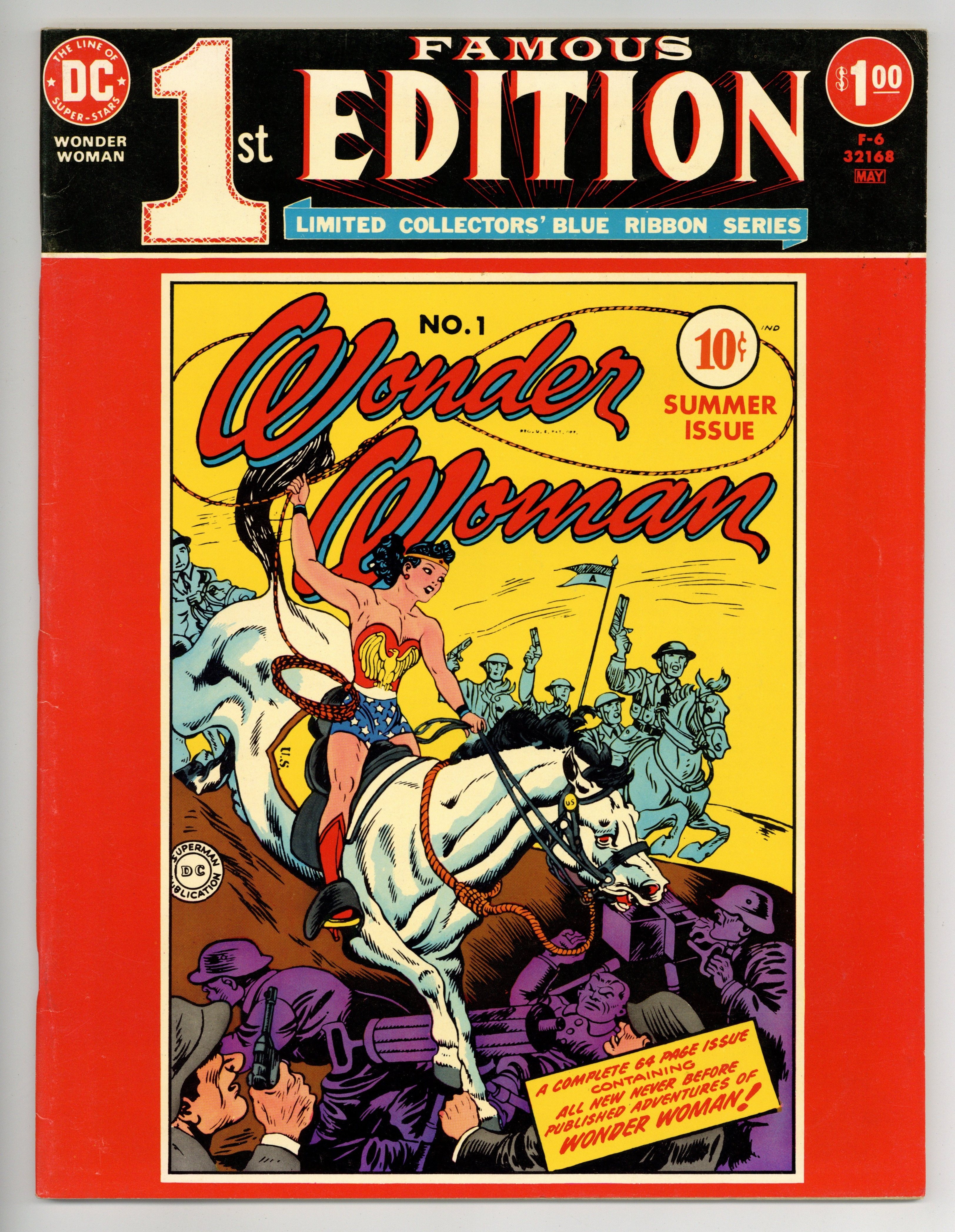$22.00Softcover Edition. Famous First Edition Limited Collectors' Blue Ribbon Series #F6: Wonder Woman #1. Reprints Wonder Woman #1 including the original ads. NOTE: This almost exact replica edition is 10 x 13-1/2" (about the size of a Life magazine). The original, 1942 first edition is standard comic book size. Cover price $1.00.