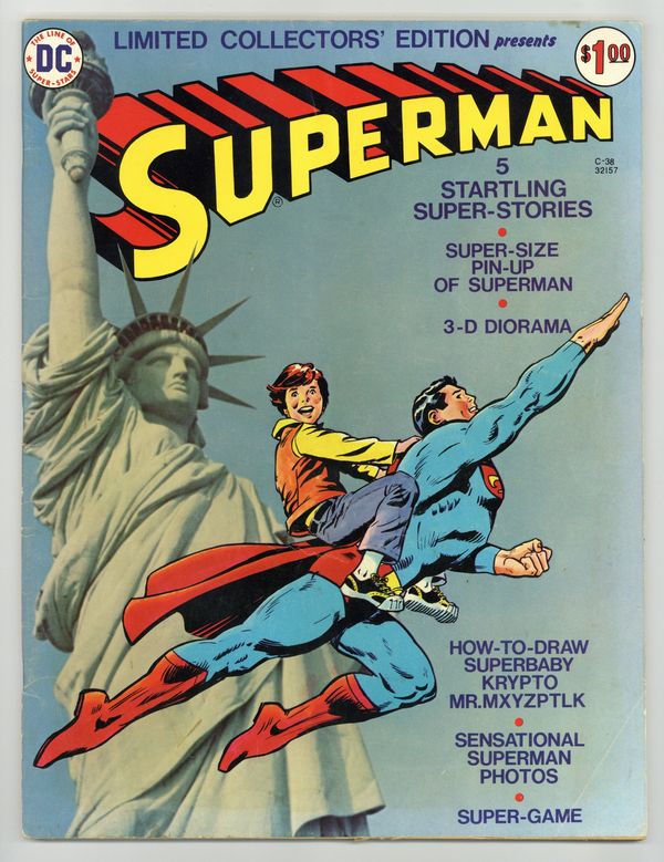 Tags: Treasury Sized Editions (part C38)$15.00Limited Collectors' Edition: Superman reprints. Neal Adams art (new?), plus Superman origin reprint by Curt Swan/Murphy Anderson. Includes War in Europe, Insurance Death Racket, The Men Who Had to Guard Superman, Lois Lanes Secret Helper (starring Krypto), The Case of the Lethal Letters. Superman puzzle. How to Draw Superman. A concept for Supermans future super-amusement park. Superman on Screen with photos. Superman 3D Diorama on back cover. 80 pgs. Size is 10 x 13-1/2" (about the size of a Life magazine). Cover price $1.00. Cover price $1.00.