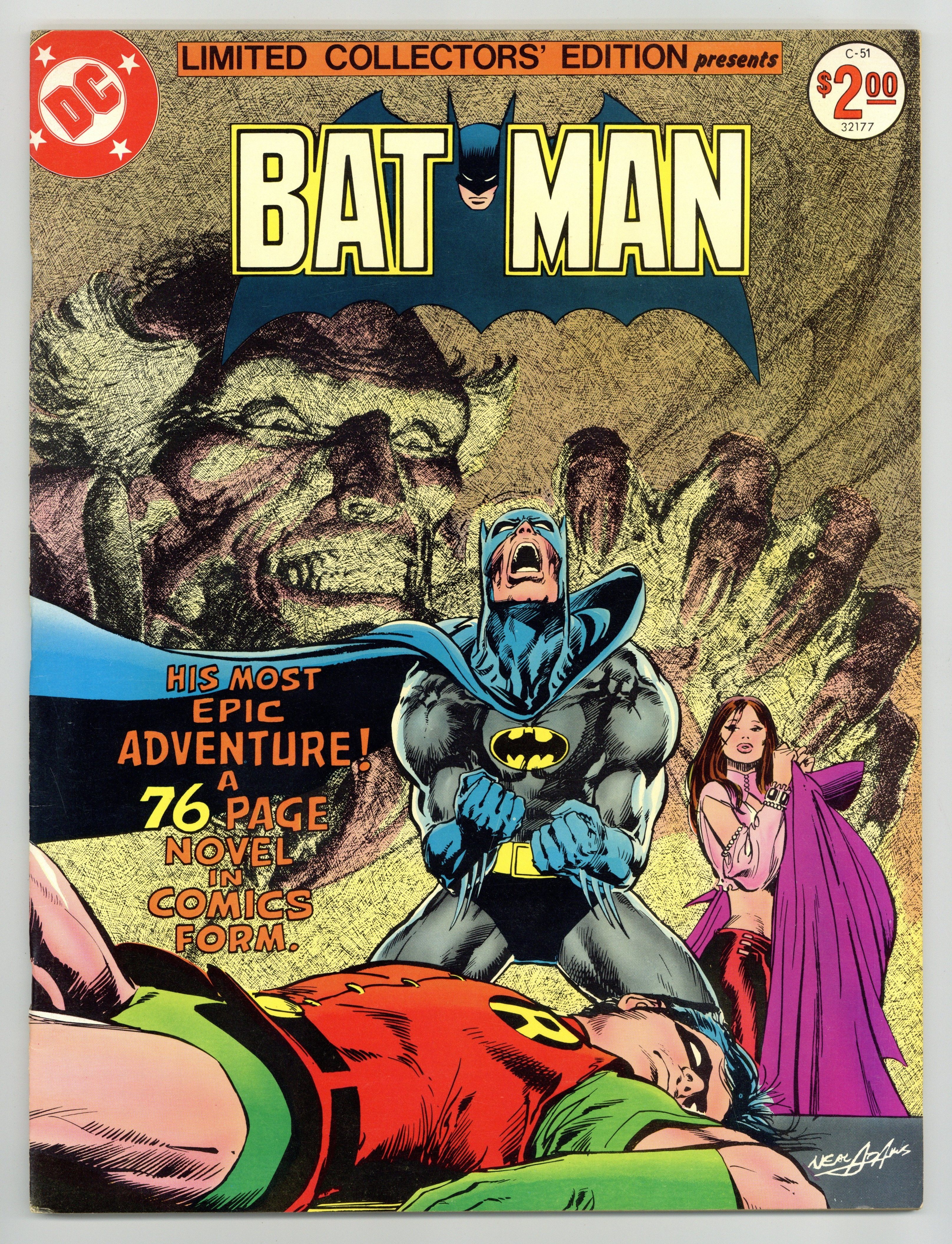 Limited Collectors' Edition: Batman reprints--the early classic Ra's al Ghul stories all in one volume! "Daughter of the Demon" (art by Neal Adams), "Bruce Wayne--Rest in Peace" (art by Irv Novick), "The Lazarus Pit" (art by Adams), and "The Demon Lives Again" (art by Adams). Reprints from Batman 232 (1st appearance of Ra's), 242-244. The inside back cover contains brief bios and small photos of Denny O'Neil, Adams, Novick, Dick Giordano, and Julie Schwartz. Size is 10 x 13-1/2" (about the size of a Life magazine). 80 pages. New Adams wraparound cover. Cover price $2.00.