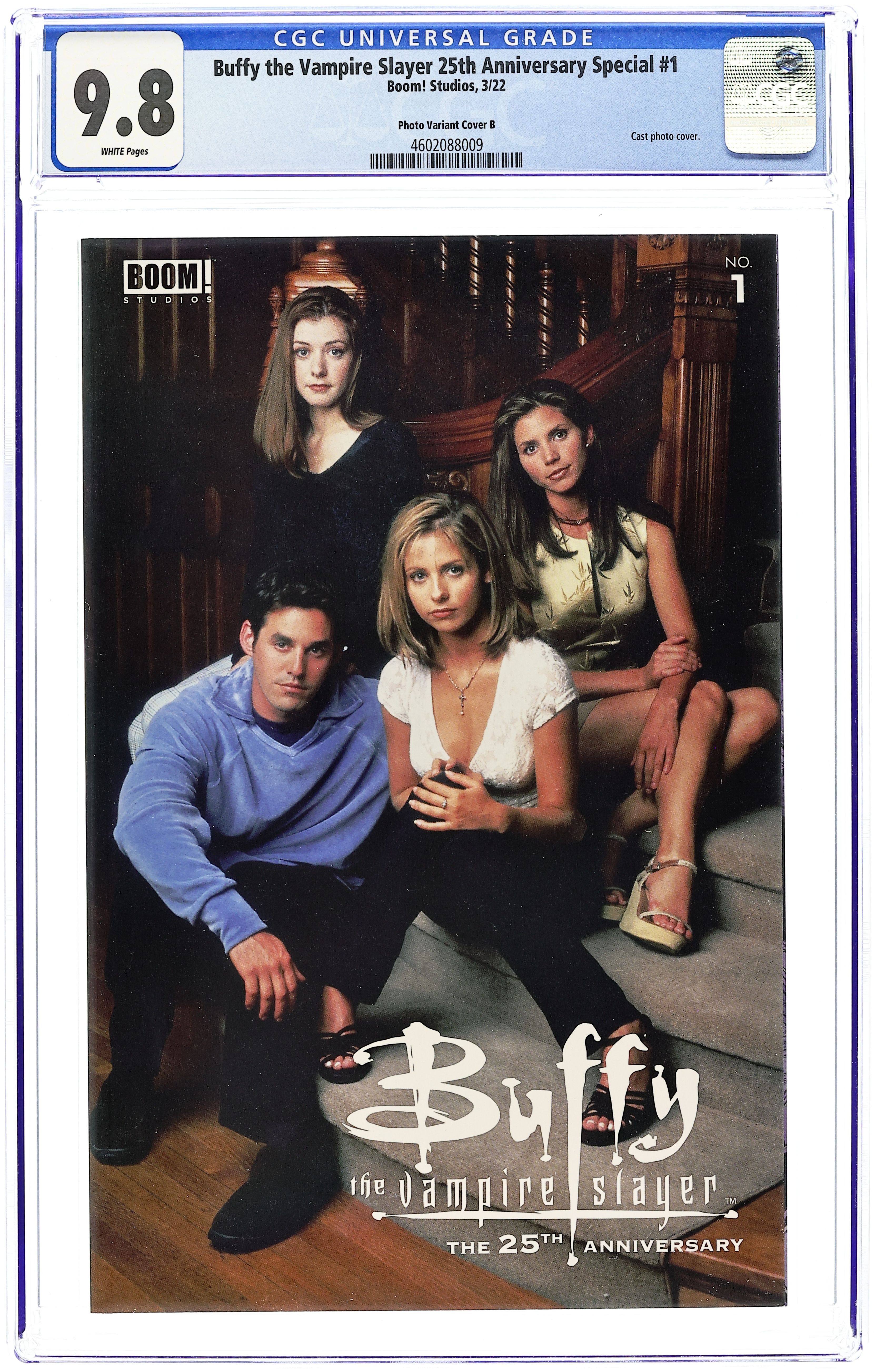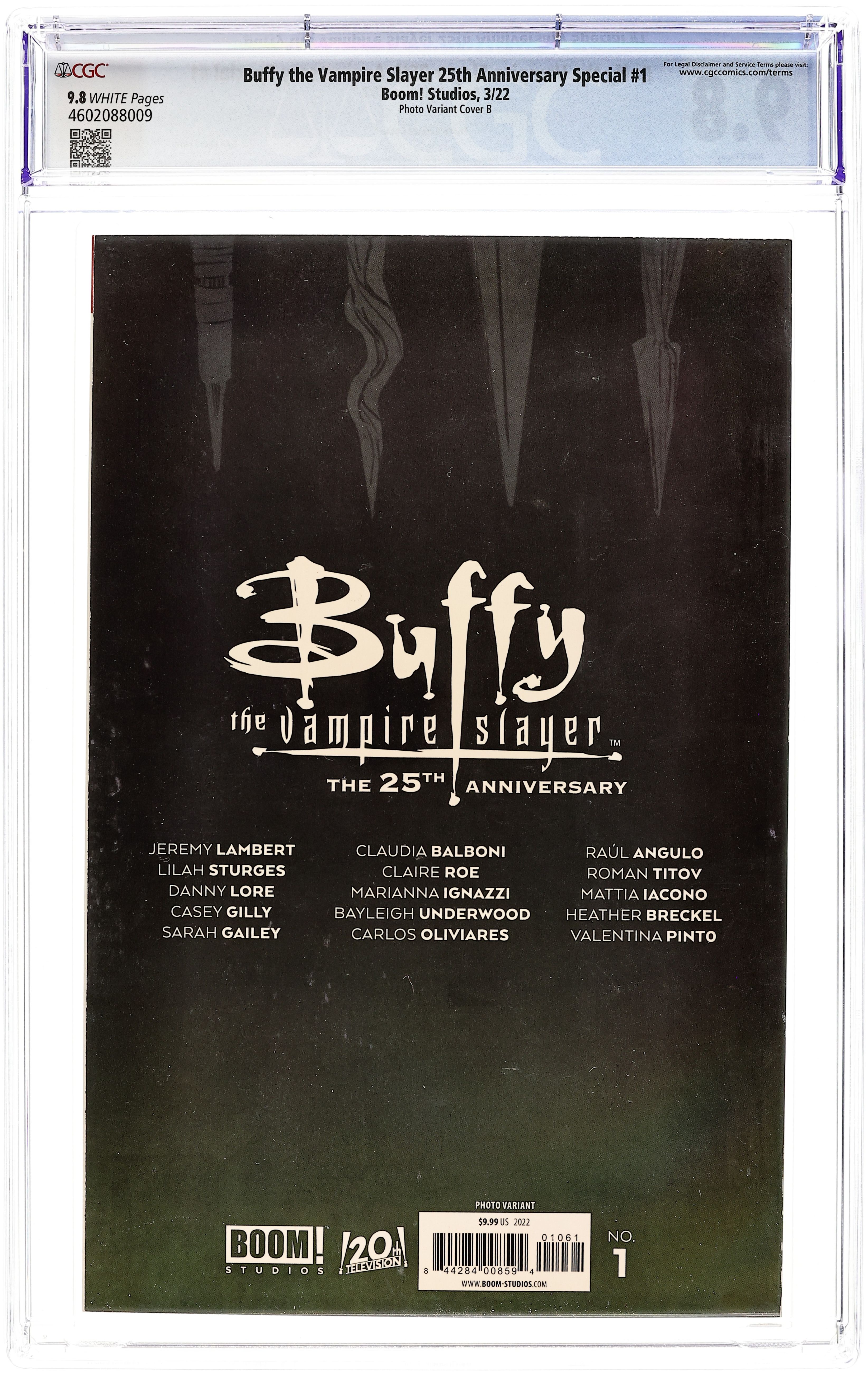 Photo Cover. 25 years later, dive into a whole new universe of stories celebrating the phenomenal icon of a generation, Buffy Summers! Where in the Multiverse is Buffy? And what's happened to the Scooby Gang? Find out in the surprising epilogue to BOOM! Studios' acclaimed first three years of Buffy the Vampire Slayer! Discover the start of an all new series about the Slayer from Hugo Award-winning author Sarah Gailey (Eat the Rich, Magic for Liars)! 64 pages, full color. Cover price $9.99.