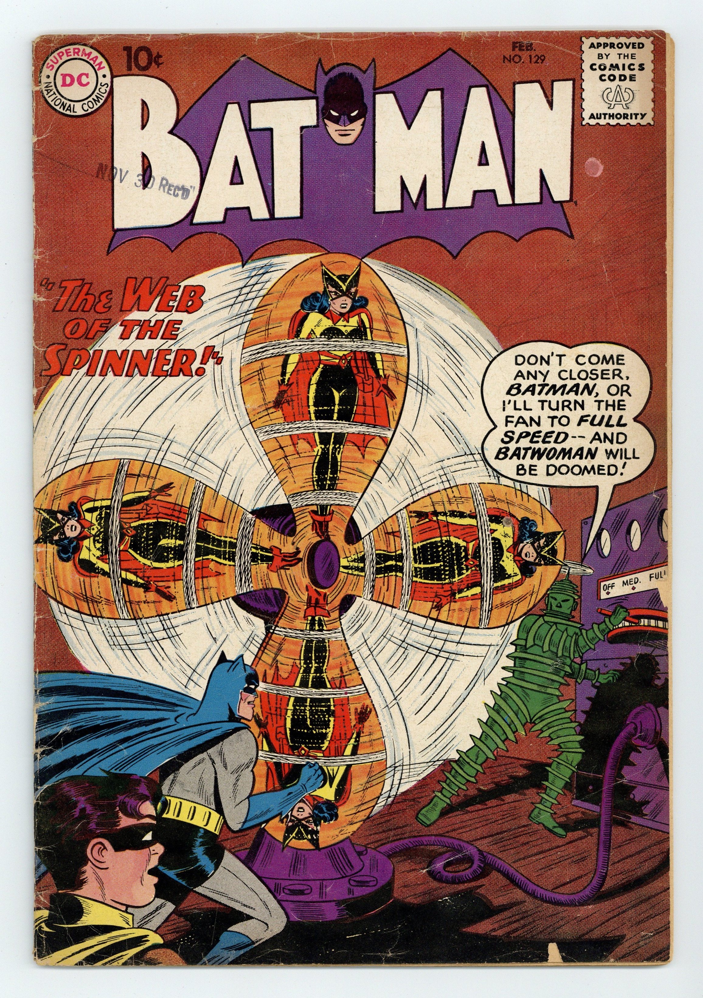 Cover by Sheldon Moldoff. "The Web of the Spinner," script by Bill Finger, pencils by Sheldon Moldoff, inks by Charles Paris; While Batman and Robin are tracking a criminal called the Spinner, Batwoman is checking out a mystic, whom she believes is running a scam operation. Detective Comics #275 ad. One-page Jail Jests story by Henry Boltinoff. The Brave and the Bold #28 ad. It's Fun to Help Others! public service announcement with Superboy, script by Jack Schiff, pencils by Curt Swan, inks by Stan Kaye. "The Man from Robin's Past," script by Bill Finger, pencils by Sheldon Moldoff, inks by Charles Paris; When stolen goods are found in the quarters of Sando the Strongman, a friend of the Grayson family who looked after Dick after his parents were murdered, Batman and Robin have to prove his innocence. Half-page Casey the Cop story by Henry Boltinoff. "Merriweather Jones--Crime Prophet!", script by Jerry Coleman, pencils by Dick Sprang, inks by Charles Paris; Merriweather Jones gets strange flashes that a crime is about occur and reports it to the police. Oddly enough, he's right; The Police believe Jones is in on the crimes and crooks believe he can help them hijack other crooks' stolen goods; It's up to Batman and Robin to save him from the crooks and clear him with the Police. World's Finest Comics #107 ad. 36 Pages, Full Color. Cover price $0.10.