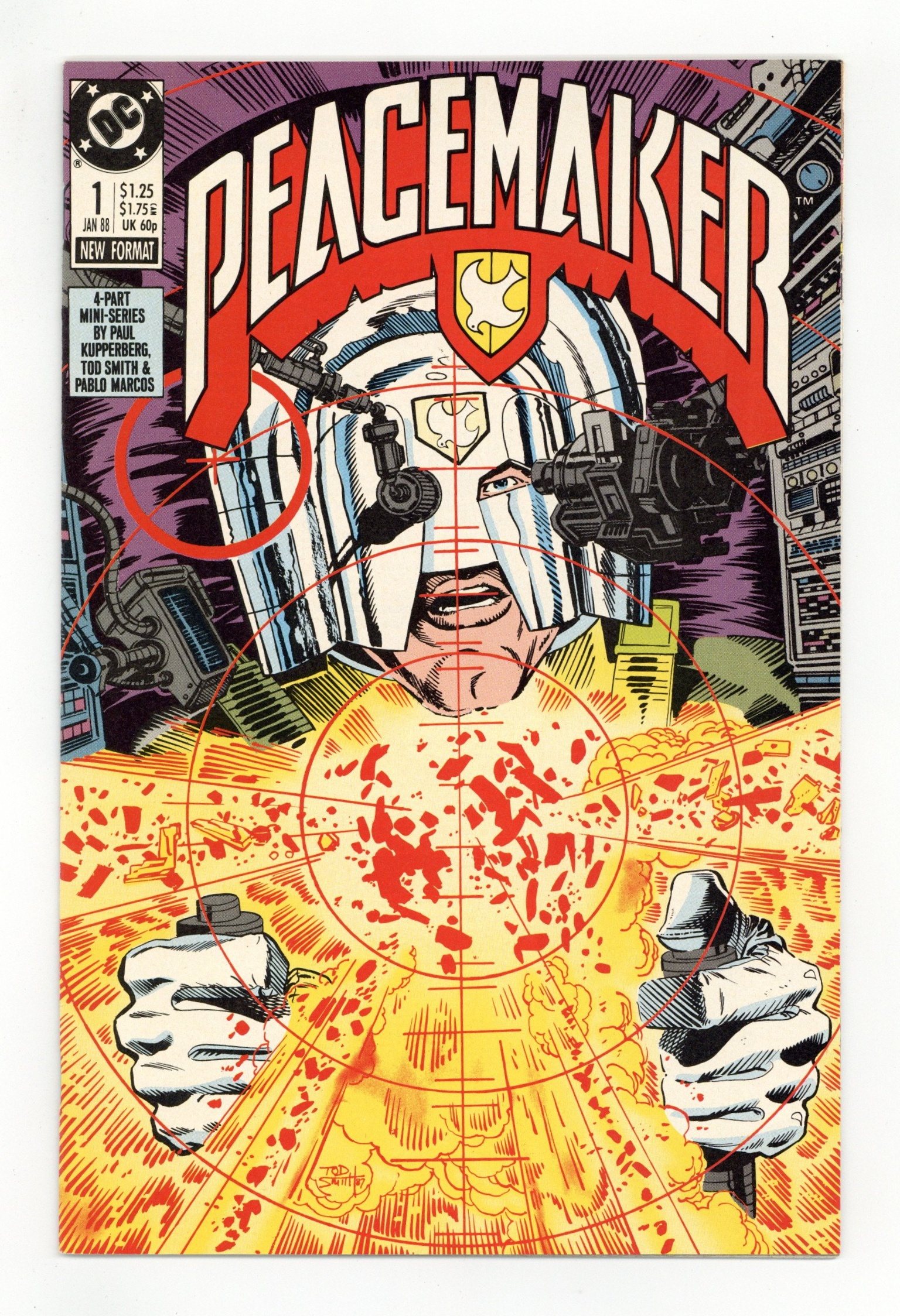 $18.75"A Breach of the Peace!" - Written by Paul Kupperberg. Art by Tod Smith and Pablo Marcos. Cover by Tod Smith. Peacemaker -- he loves peace so much, he's willing to kill for it! From his base in Switzerland, industrialist Christopher Smith fights a private battle against terrorism armed with state-of-the-art weaponry and a deadly willingness to use it. But Christopher Smith, Peacemaker, has another secret -- he's a man on the very edge of sanity! The dark memories of his childhood and a father touched by evil have left Christopher with a taste for dealing death to terrorists...and anyone else who gets in his way. Back under control of the U.S. intelligence Agency which captured him in VIGILANTE, Peacemaker must stop the insidious plans of Doctor Tzin-Tzin, notorious Batman foe, as the villain embarks on his newest venture: supplying "designer violence" to anyone willing to pay the price...and toppling the Russian government in order to increase the "market" for his murderous wares! It's a job made to order for Peacemaker's skills, provided his cohorts -- all undercover government specialists -- can help him maintain a hold on his sanity! Characters in this issue: Peacemaker [Christopher Smith] (origin); Dominique St. Clare; Ross Llewellyn; Bridgette D'Abo; Harvey Stein; Doctor Tzin-Tzin; Micah; Ochfeld; Frank Keller. New Format. 32 pages, full color. Cover price $1.25.