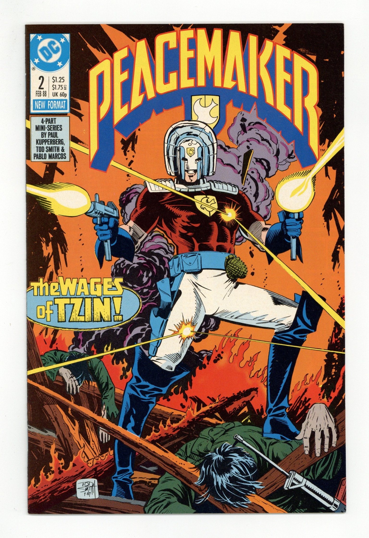 "The Wages of Tzin!" - Written by Paul Kupperberg. Art by Tod Smith and Pablo Marcos. Cover by Tod Smith. Even as Peacemaker gets closer to uncovering the mastermind behind the terrorist attacks, the terrorists are luring him into a deadly trap! New Format. 32 pages, full color. Cover price $1.25.