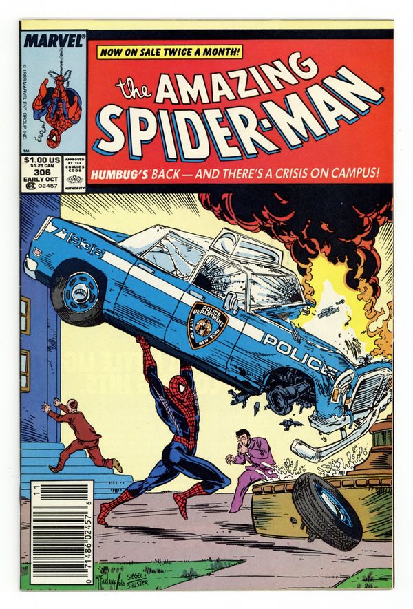 Newsstand Edition. "Humbugged!" Script by David Michelinie. Art by Todd McFarlane. Cover by Todd McFarlane. The pesky Humbug is back! And the insect-infatuated villain wants to resume his research on the ESU campus! But the crazy entomologist runs into his most-reviled insect first: the Spectacular Spider-Man! Let the extermination begin! Meanwhile at Bedford Towers, Peter and Mary Jane's neighbor, Jonathon Caesar, is acting stranger and stranger...perhaps even a bit obsessive! Cameo appearances by the Chameleon, Aunt May, and the Black Cat. (Notes: The Humbug previously appeared in Web of Spider-Man 19. McFarlane's cover is a tribute to the 50th anniversary of Superman and the cover of Action Comics #1.) 36 pgs. Cover price $1.00.