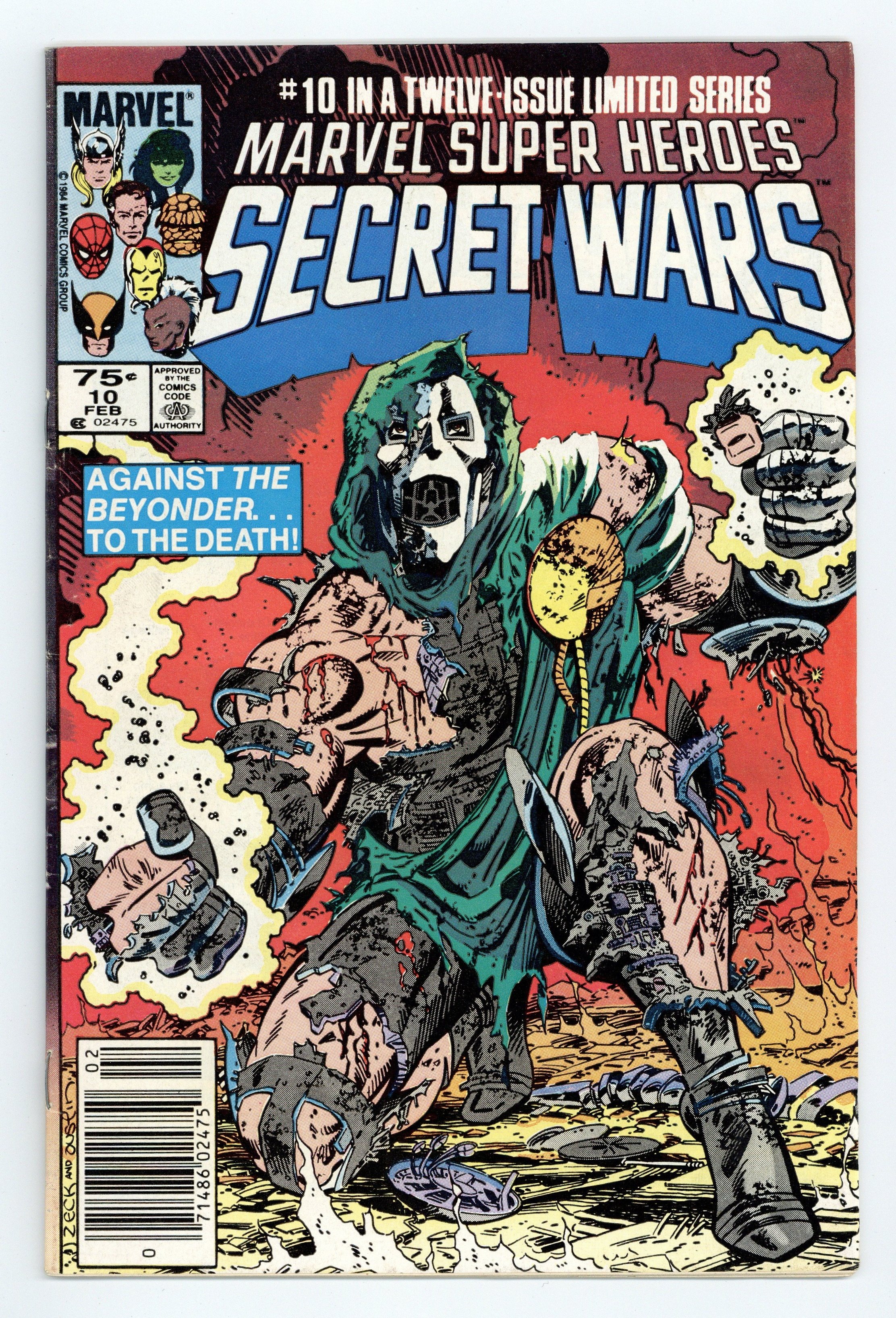 Newsstand Edition. "Death to the Beyonder!" Part 10 of 12. Story by Jim Shooter. Art by Mike Zeck and John Beatty. It's Doctor Doom vs. the Beyonder. The nefarious villain has stolen vast amounts of cosmic energy from mighty Galactus and now stands in defiance before the nigh omnipotent Beyonder. What follows is a battle that will rock the cosmos, and only one shall survive. 36 pages, full color. Cover price $0.75.