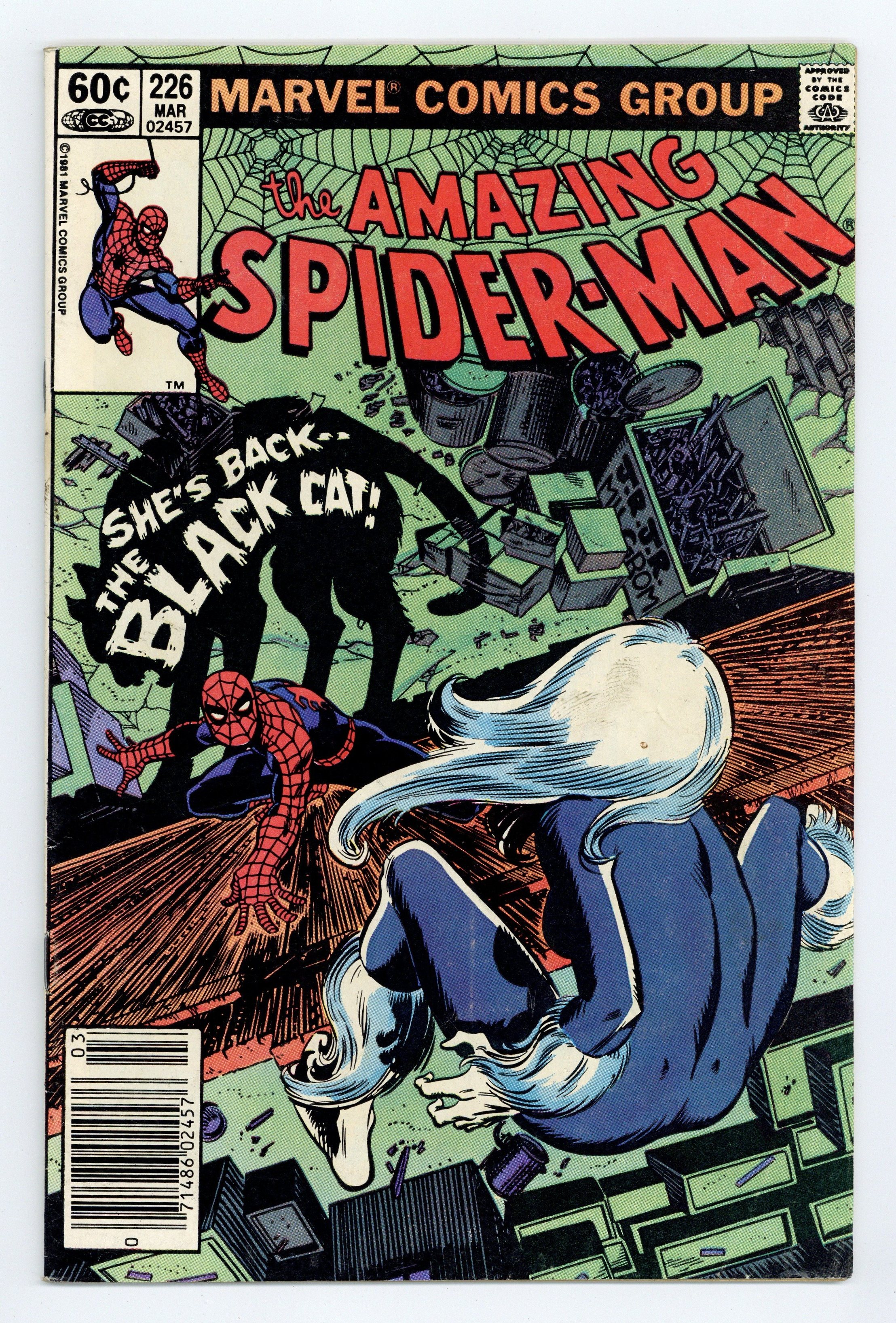 Tags: Black Cat, Spider-Man$27.00Newsstand Edition. "But the Cat Came Back" Part 1 of 2. Script by Roger Stern. Art by John Romita Jr. (breakdowns) and Jim Mooney (finishes). Cover by John Romita Jr. and Al Milgrom. Because the fans demanded her, the Black Cat is back! And flirting and fighting with the web-slinger all over again! After Felicia escapes from the psychiatric hospital, she resumes her high-dollar heists! But soon realizes that it's not as much fun without Spider-Man chasing her! So the cat burglar extraordinaire arranges an evening rendezvous with her favorite wall-crawler at their first date location (from Amazing Spider-Man 194). Will the enchanting cat mesmerize the Spectacular Spider-Man once more? Or can the web-slinger resist her feline charms? An excellent issue! Cameo appearances by the Foolkiller and Captain Jean DeWolff. (Notes: This was a highly anticipated issue for fans of the wall-crawler; and Stern & Romita Jr. did not disappoint. The Black Cat previously appeared in Amazing Spider-Man 205. This story was reprinted in Spider-Man Magazine 2 and also in the trade paperback: Spider-Man vs. the Black Cat (2005). The back cover features a full-page ad for Dungeons & Dragons with art by Bill Willingham.) 36 pgs. Cover price $0.60.