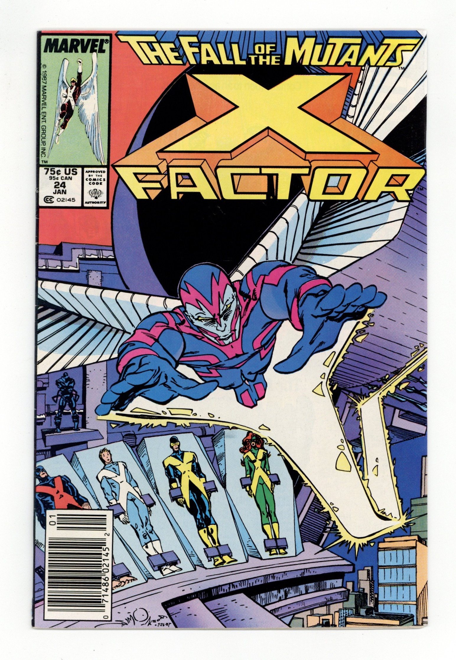 Newsstand Edition. Fall of the Mutants! Part 1 of 3. "Masks!" 1st full appearance of Archangel. Story by Louise Simonson. Art by Walter Simonson and Bob Wiacek. One of the biggest mutant events to ever hit the comic racks begins here. The powerful mutant known as Apocalypse finally makes his move and unleashes his Four Horseman on an unsuspecting world. The only thing standing between humanity and total annihilation is X-Factor. However when the fourth and final Horseman, Death, reveals his true identity, the group will be rocked to its very core. This is a pivotal chapter in the lives of the original X-Men. Cover price $0.75.