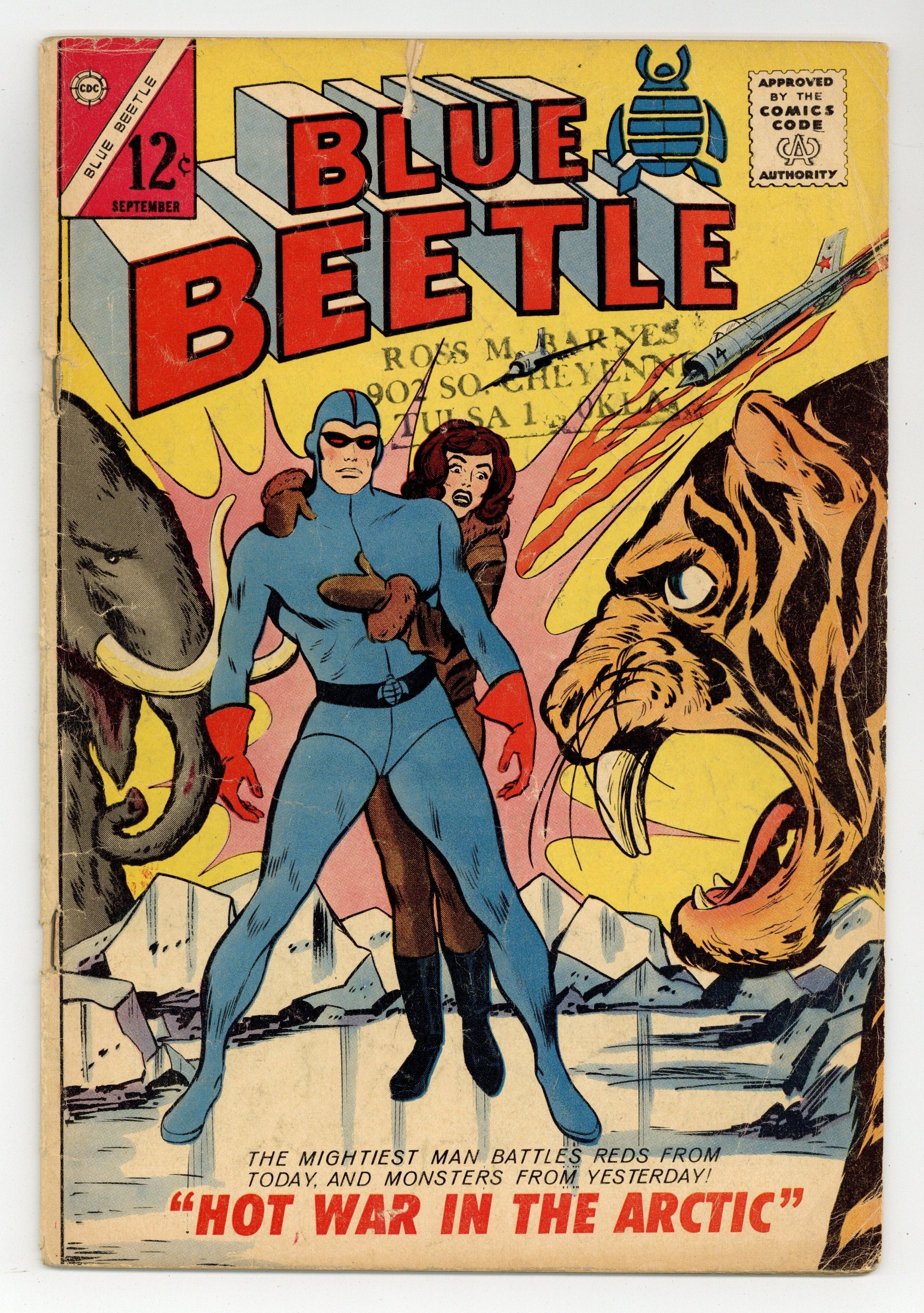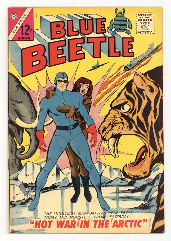 Cover by Vince Colletta. Stories and art by Joe Gill, Bill Fraccio and Tony Tallarico. The second Charlton series to feature Dan Garrett, the Golden Age Blue Beetle. In the frozen North, Blue Beetle faces both prehistoric monsters and Commie spies, bringing new meaning to the phrase "Cold War." Trina and Jacques discover the Lost City of Atlantis in an air pocket on the ocean floor. Hot War in the Arctic; The Waiting Game; Space Engineering; The Thief; The Lost City. 32 pages, Full Color. Cover price $0.12.