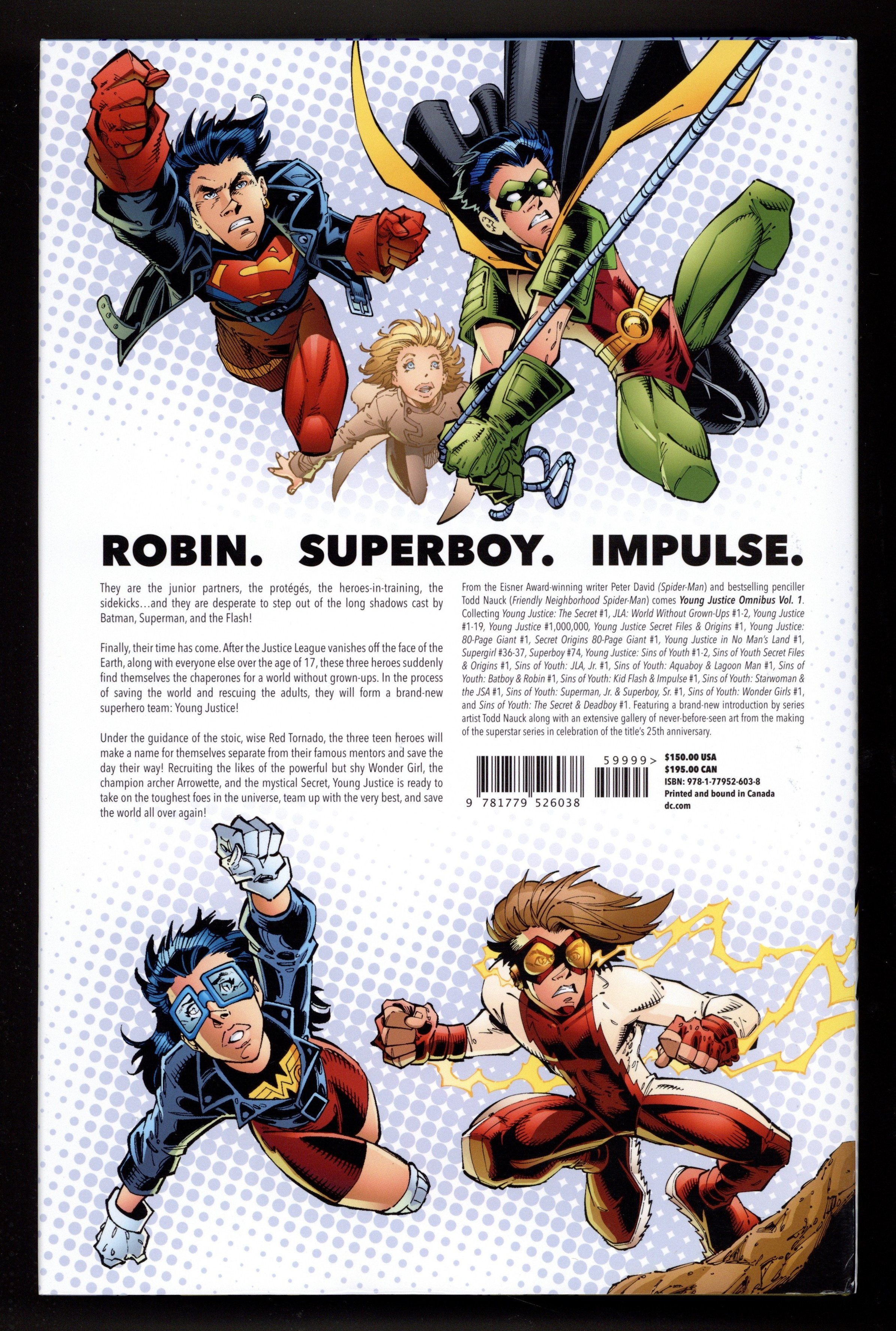 Volume 1 - 1st printing. Collects Young Justice (1998-2003 DC 1st Series) #1-19; Young Justice One Million (1998); JLA: World Without Grown-Ups (1998) #1-2; Young Justice: The Secret (1998 DC) Girlfrenzy!; Young Justice Secret Files (1999); Secret Origins 80-Page Giant (1999); Young Justice In No Man's Land (1999); Supergirl (1996-2003 3rd Series) #36-37; Superboy (1994-2002 3rd Series) #74; Sins of Youth: Young Justice (2000) #1-2; Sins of Youth Secret Files (2000); Sins of Youth: JLA Jr. (2000); Sins of Youth: Aquaboy and Lagoon Man (2000 DC); Sins of Youth: Batboy and Robin (2000); Sins of Youth: Kid Flash and Impulse (2000 DC); Sins of Youth: Starwoman and the JSA, Jr. (2000 DC); Sins of Youth: Superman Jr. and Superboy Sr. (2000 DC); Sins of Youth: Wonder Girls (2000); and Sins of Youth: The Secret and Deadboy (2000 DC). Written by Peter David, Chuck Dixon, Todd Dezago, Scott Beatty, Karl Kesel, D.C. Johnson, Ben Raab, Dwayne McDuffie, Geoff Johns, and Brian K. Vaughn. Art by Todd Nauck, Coy Turnbull, Angel Unzueta, Craig Rousseau, Roberto Flores, Mike McKone, Humberto Ramos, Andy Kuhn, Leonard Kirk, Tom Grummett, Carlo Barberi, Sunny Lee, Cary Nord, Drew Johnson, Rob Haynes, Scott Kolins, Mike Oeming, Lary Stucker, Jaime Mendoza, Jon Sibal, Norm Rapmund, Sean Parsons, Wayne Faucher, Chris Ivy, Robin Riggs, Keith Champagne, Mark Lipka, Rich Faber, and Jason Baumgartner. Cover by Todd Nauck and Lary Stucker. DC's newest teen heroes get collected in a new omnibus series! Hardcover, 8 1/2-in. x 11-in., 1,208 pages, full color. Cover price $150.00.