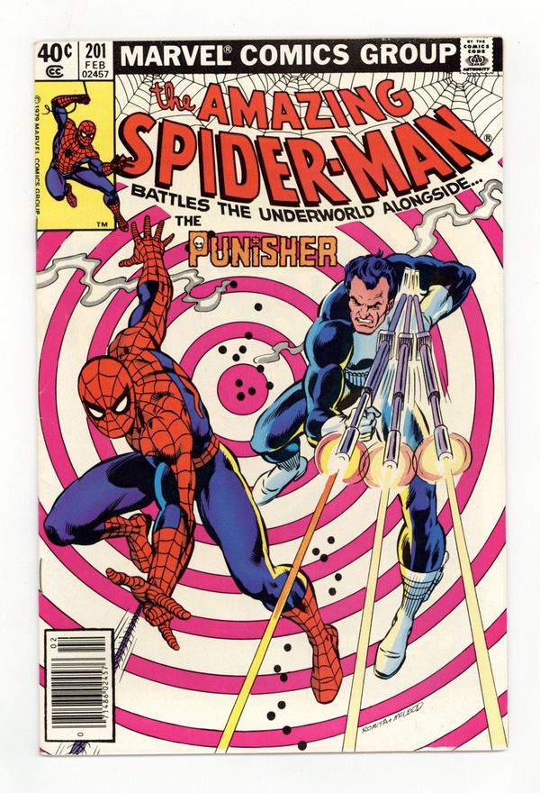 Tags: Spider-Man$42.50Newsstand Edition. "Man-Hunt!" Part 1 of 2. Guest-starring the Punisher. Script by Marv Wolfman. Art by Keith Pollard (layouts) and Jim Mooney (finishes). Cover by John Romita and Bob McLeod. The action starts with a bang as the web-slinger catches a man falling out of a high-rise office building! When Spider-Man swings inside to investigate, he discovers the source of the problem: the Punisher! What has Frank Castle been up to since Spidey last saw him (in Amazing Spider-Man 175)? Oh, just business as usual...terrorizing the underworld! The following day to his surprise, the Punisher sees pictures of his penthouse gun battle in the Daily Globe! Credited to a photographer named Peter Parker! This troubles the Punisher! And that means trouble for Aunt May's nephew! War Journal Entry #519 is coming up next at a particular superhero's Chelsea apartment! Appearances by J. Jonah Jameson, Joe Robertson, Dr. Marla Madison, Aunt May, and Mary Jane Watson. (Notes: The Punisher previously appeared in Captain America 241. Mary Jane appears next in the classic Marvel Team-Up 79 where (as Red Sonja) she battles Kulan Gath alongside the web-slinger. This is one of Mary Jane's very few appearances between 1979 and 1983. She returns to the Amazing Spider-Man title in issue 238. This story was reprinted in Marvel Tales 218.) 36 pgs. Cover price $0.40.