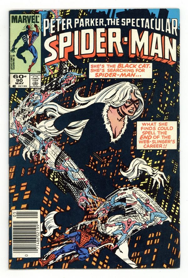 Newsstand Edition. "Where, Oh Where Has My Spider-Man Gone?" Script and Pencils by Al Milgrom. Inks by Jim Mooney. Cover by Al Milgrom. The Spectacular Spider-Man is missing! Where is he? The Black Cat is looking everywhere! She checks with everyone including Mrs. Muggins, Captain DeWolff, J. Jonah Jameson, Aunt May, and the Avengers! When the web-slinger finally reappears on the final page, he's wearing his new black costume! Cameo appearances by the Vision and the Scarlet Witch. (Notes: Spider-Man's new costume debuted this month in Amazing Spider-Man 252, Marvel Team-Up 141, and this issue. The letters page includes a statement of ownership: average print run 351,448; average paid circulation 172,290.) 36 pages Cover price $0.60.
