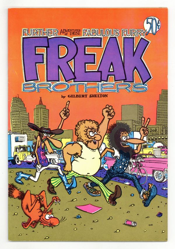 Published 1972 by Rip Off Press.$6.802nd printing - glossy blue interior cover variant. Gilbert Shelton story, cover and art. Dave Sheridan, Ted Richards and Bobby London story and art. MATURE READERS. NOTE: 50¢ cover, inside front cover is blue colored. Has Free Funnies ad on p.49 (front of last interior page) AND the leftmost comic on bottom row of the inside back cover ad is for this issue of Freak Brothers, not Big Ass Comics. Cover price $0.50.