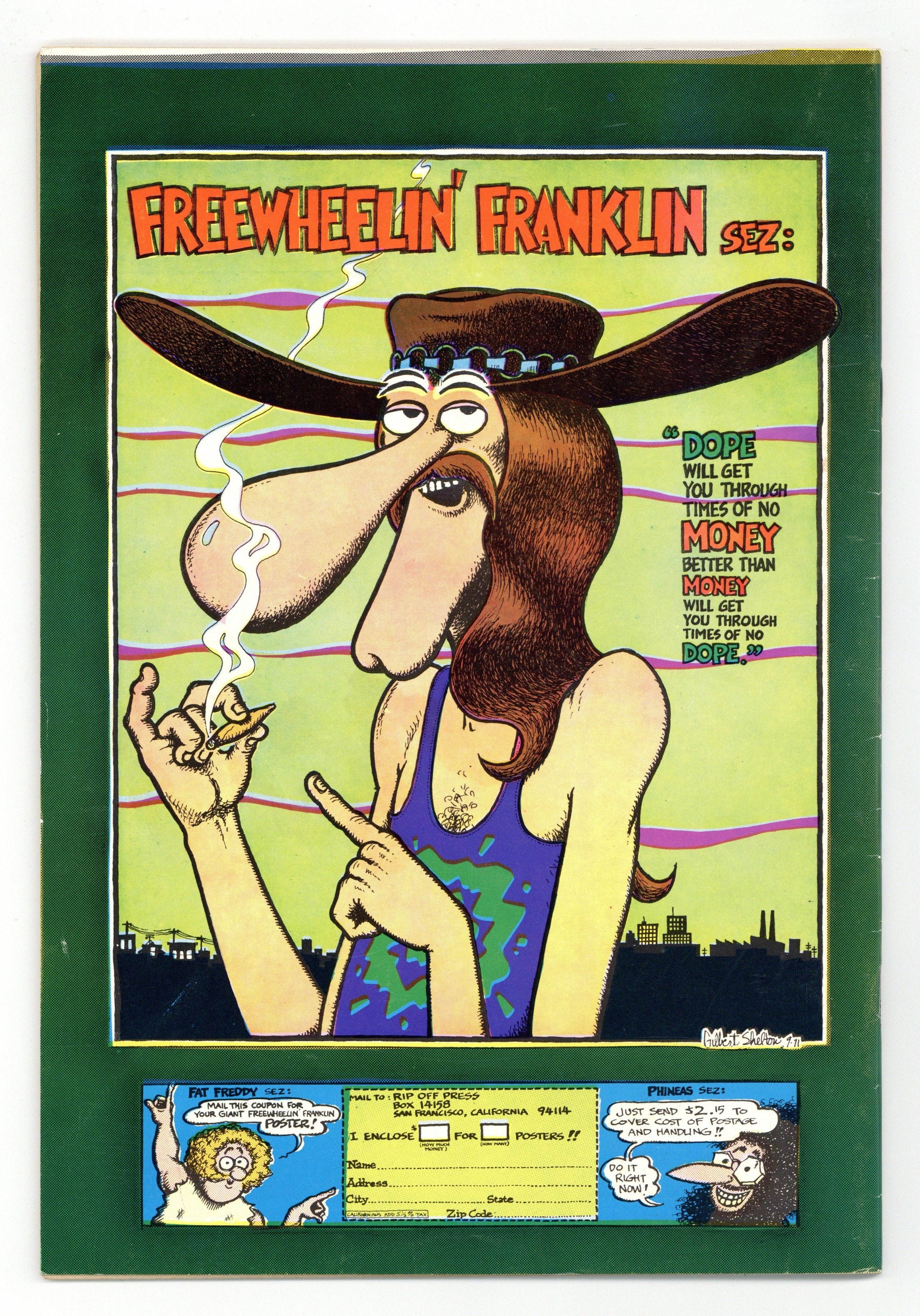 Published 1972 by Rip Off Press.$45.002nd printing - glossy blue interior cover variant. Gilbert Shelton story, cover and art. Dave Sheridan, Ted Richards and Bobby London story and art. MATURE READERS. NOTE: 50¢ cover, inside front cover is blue colored. Has Free Funnies ad on p.49 (front of last interior page) AND the leftmost comic on bottom row of the inside back cover ad is for this issue of Freak Brothers, not Big Ass Comics. Cover price $0.50.