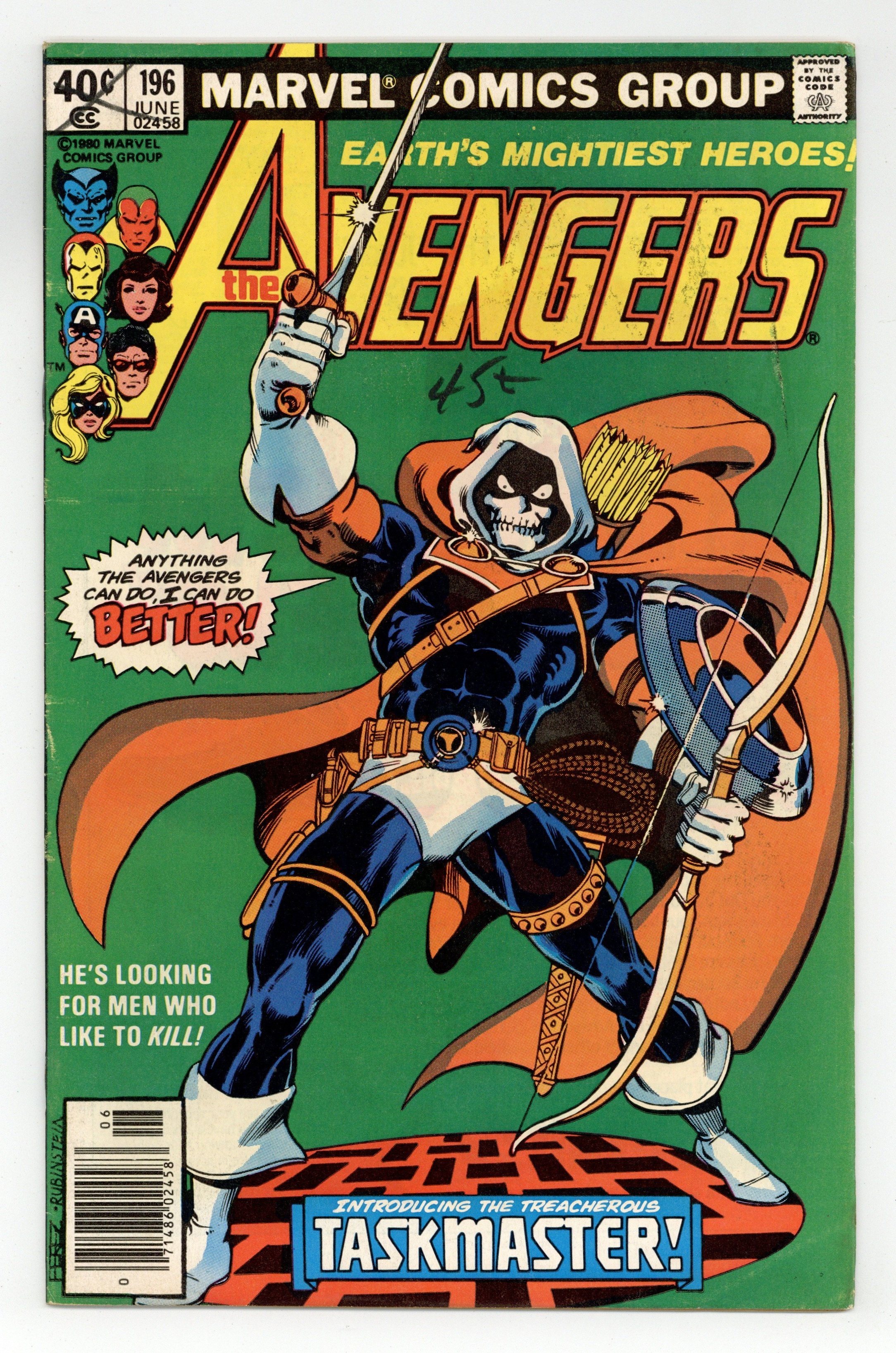 Newsstand Edition. "The Terrible Toll of the Taskmaster" Guest-starring Ant-Man. Script by David Michelinie. Pencils by George Perez. Inks by Jack Abel. Cover by George Perez and Joe Rubinstein. A brand new villain, the Taskmaster, has turned the tables on the Wasp, Yellowjacket, and Ant-Man! The three insect-like super-heroes are prisoners inside the Taskmaster's training academy! The good news is that seven avengers are waiting outside the training compound, but the bad news...none of them know that their teammates are in grave danger! However, Earth Mightiest Heroes follow the ants, and the trail leads to the Taskmaster! Is the villain with the photographic reflexes ready to battle the Avengers? Choose wisely dear Taskmaster! First (full) appearance and origin of the Taskmaster. (Notes: The Taskmaster appears next in Marvel Team-Up 103. The letters page includes a letter from comics writer Kurt Busiek.) 36 pages Cover price $0.40.