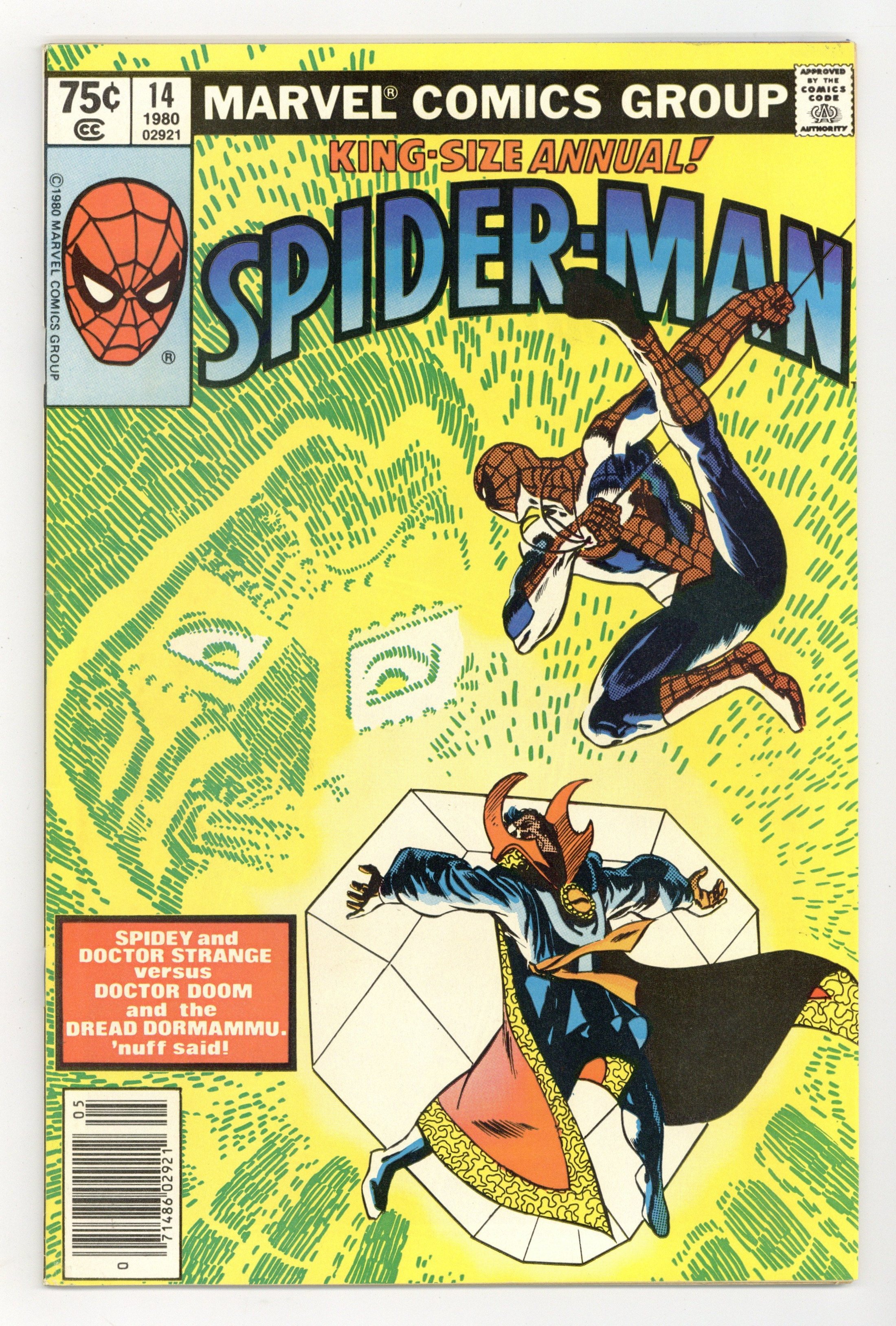 Newsstand Edition. "The Book of the Vishanti" Guest-starring Doctor Strange. Script by Denny O'Neil. Pencils by Frank Miller. Inks by Tom Palmer. Cover by Frank Miller. Doctor Doom and the Dread Dormammu conspire to bring the Bend Sinister phenomenon to Earth's dimension! And the Master of the Mystic Arts is the only person who understands the great evil that now threatens the planet! However Doom and Dormammu's earthly pawn captures Dr. Strange with a surprise attack in Greenwich Village! But before the good doctor goes down, he sends forth a psychic flare for help...to any superhero available in the Big Apple! On this moonlit night, there is only one hero present to answer the call: the Amazing Spider-Man! The web-slinger usually deals with modest villains and small-time criminals; but tonight, the wall-crawler tangles with the heavyweights! Earth's precarious future lies in the hands of your friendly neighborhood Spider-Man! (Notes: This issue features outstanding artwork by Frank Miller and Tom Palmer. This story was reprinted in Marvel Tales 200 and also in the (1994) Complete Frank Miller Spider-Man.) 52 pages. Cover price $0.75.